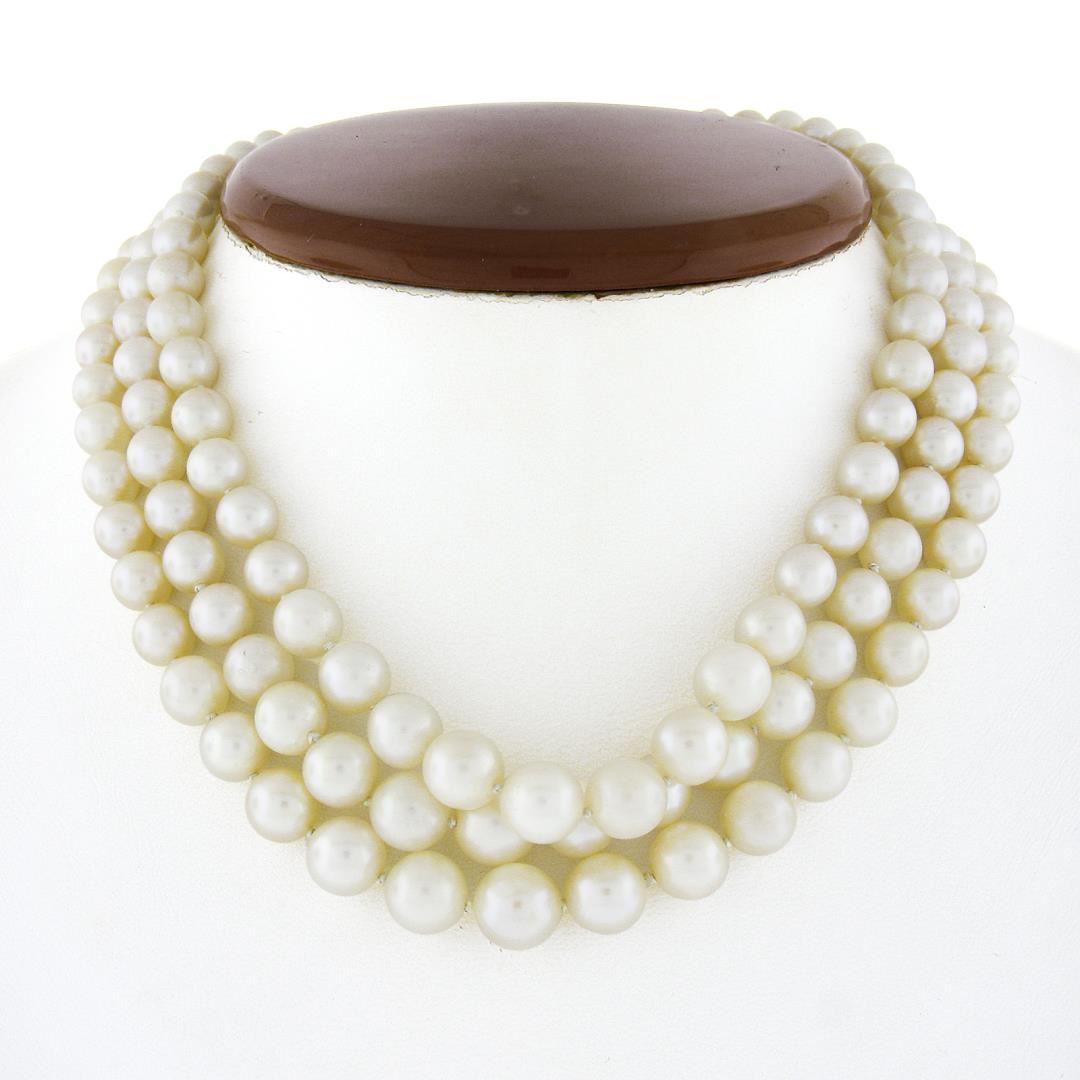 14.5" 3 Row Pearl Strand Necklace w/ 10k Gold Turquoise Twisted Wire Push Clasp