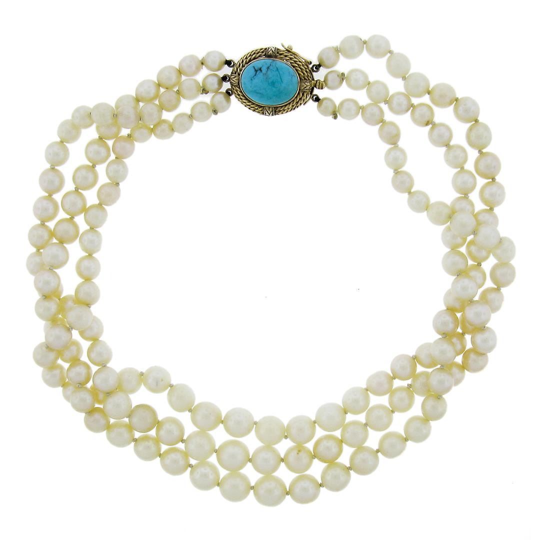 A 3 row pearl strand necklace with 10k yellow gold clasp, featuring numerous of round cultured pearls (5mm to 9mm each), and 1 oval cabochon cut natural turquoise (14.7x11.8mm). It weighs a total of 77.30 grams, measures 24.4mm wide, and measures 14.5 inches in length.