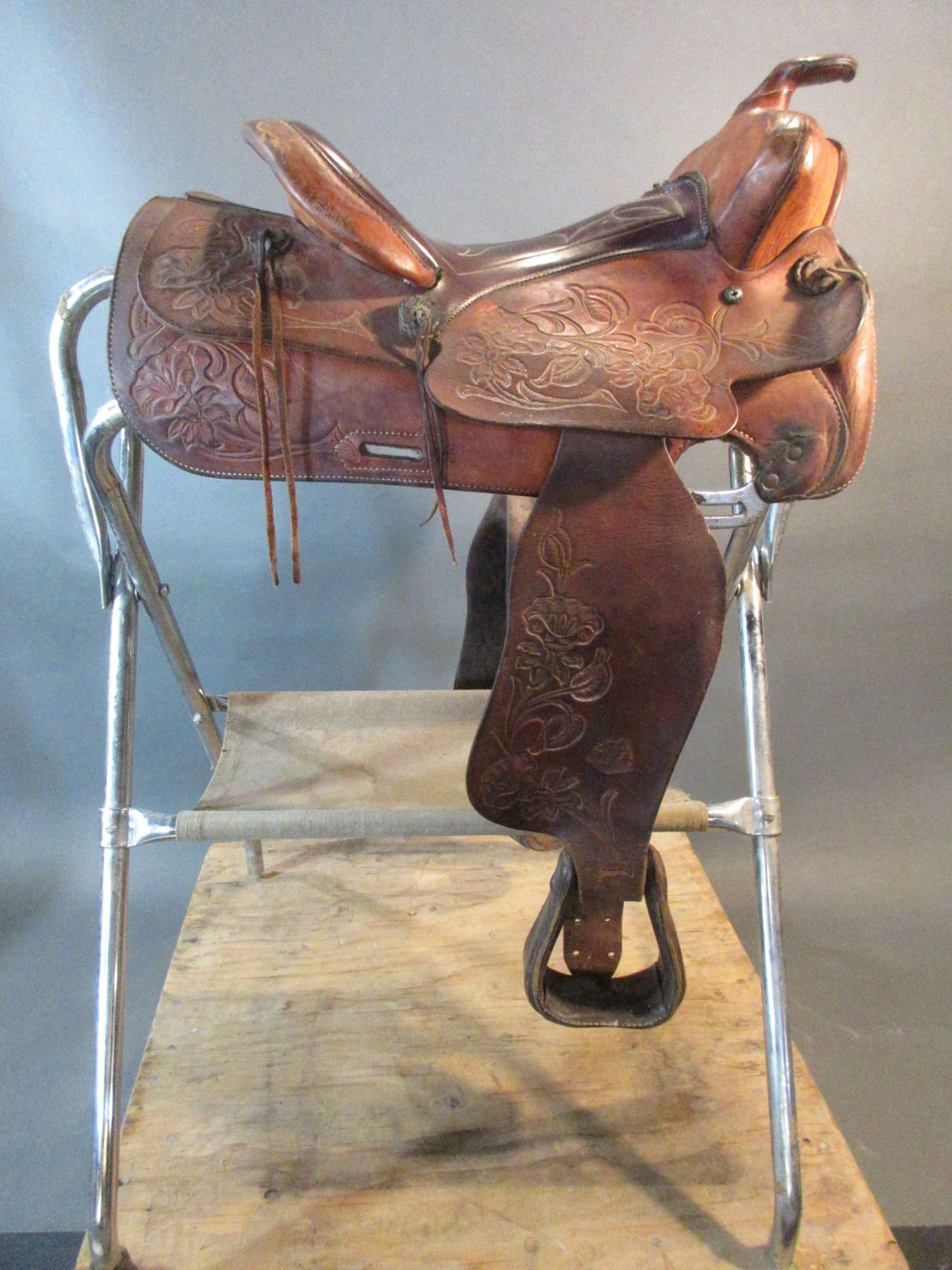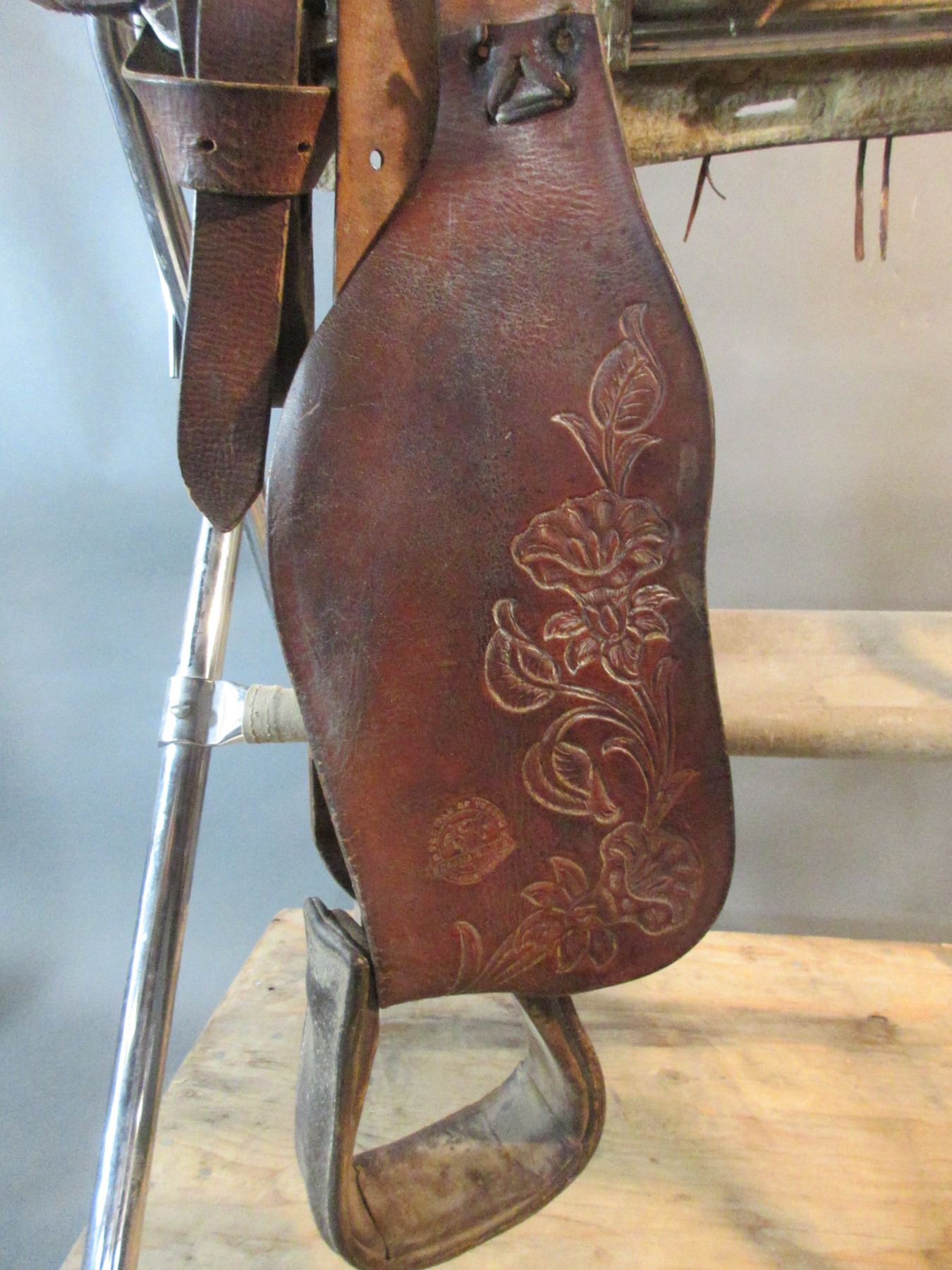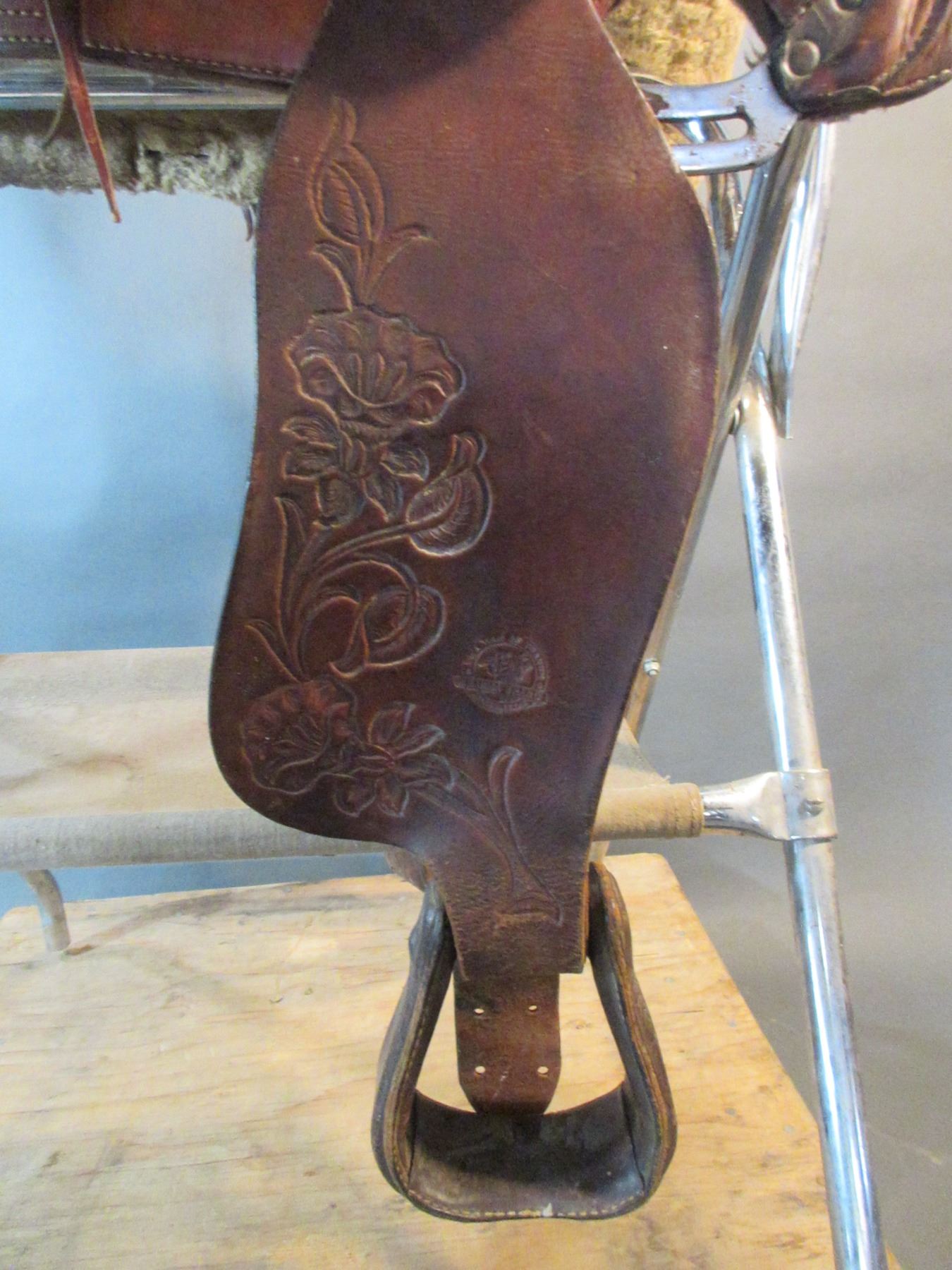 14.5" Padded Seat Saddle- Tooled- Good Sheepskin- Been Repaired- Fair Condition- Sells With Stand
