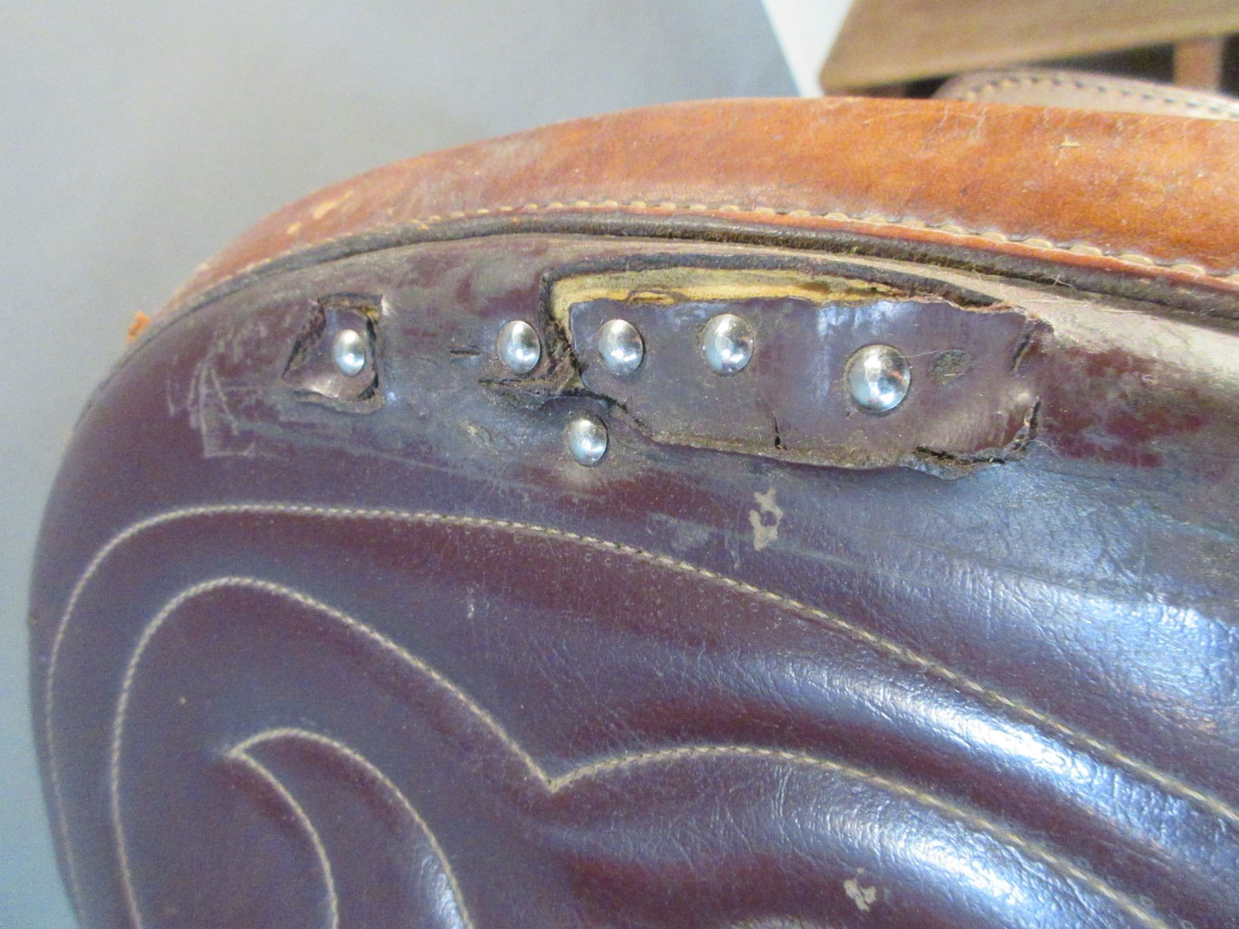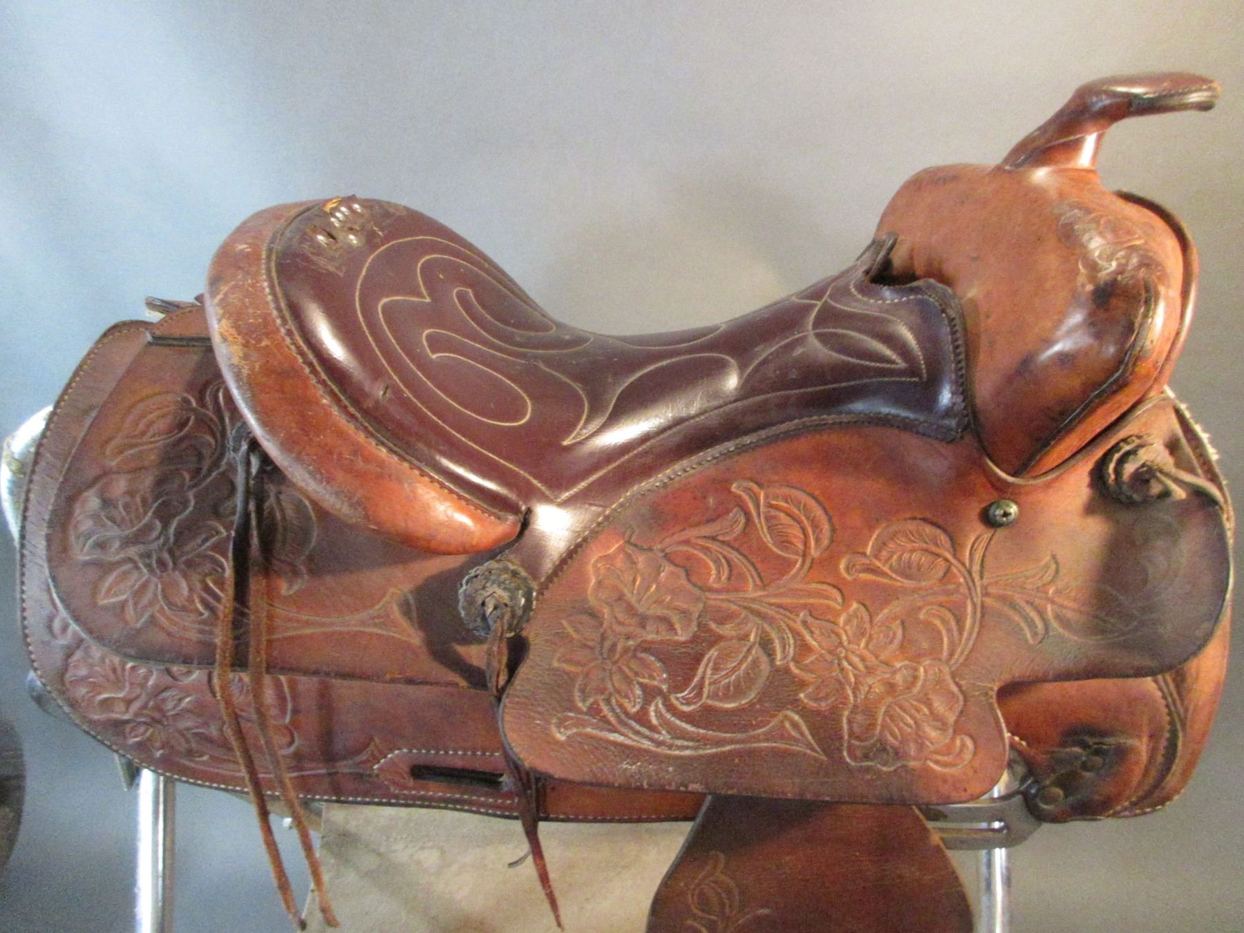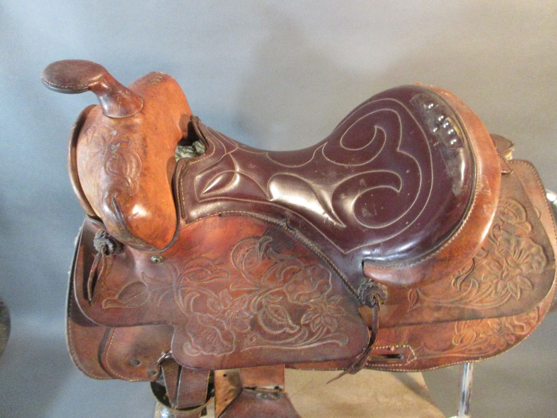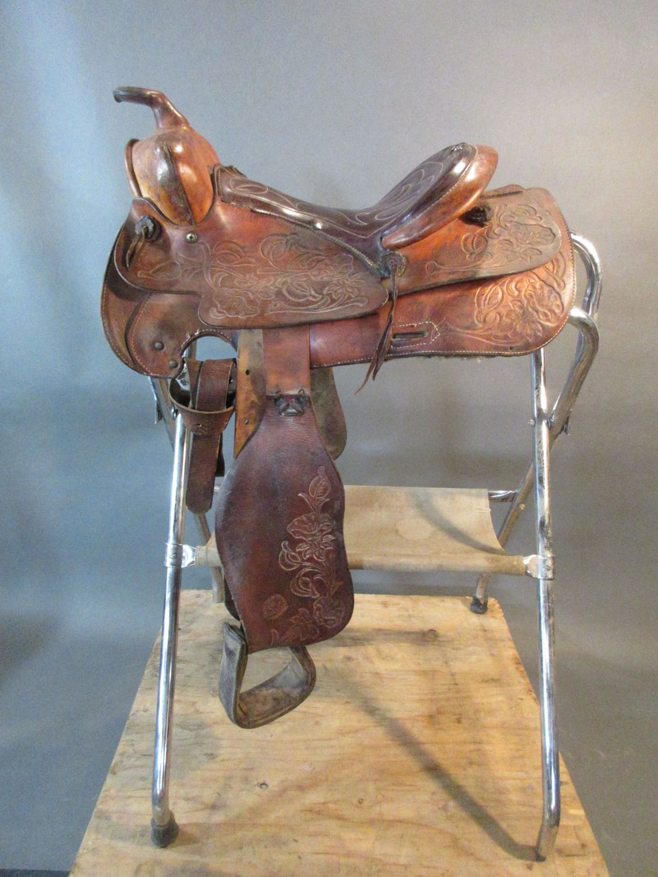 14.5" Padded Seat Saddle- Tooled- Good Sheepskin- Been Repaired- Fair Condition- Sells With Stand