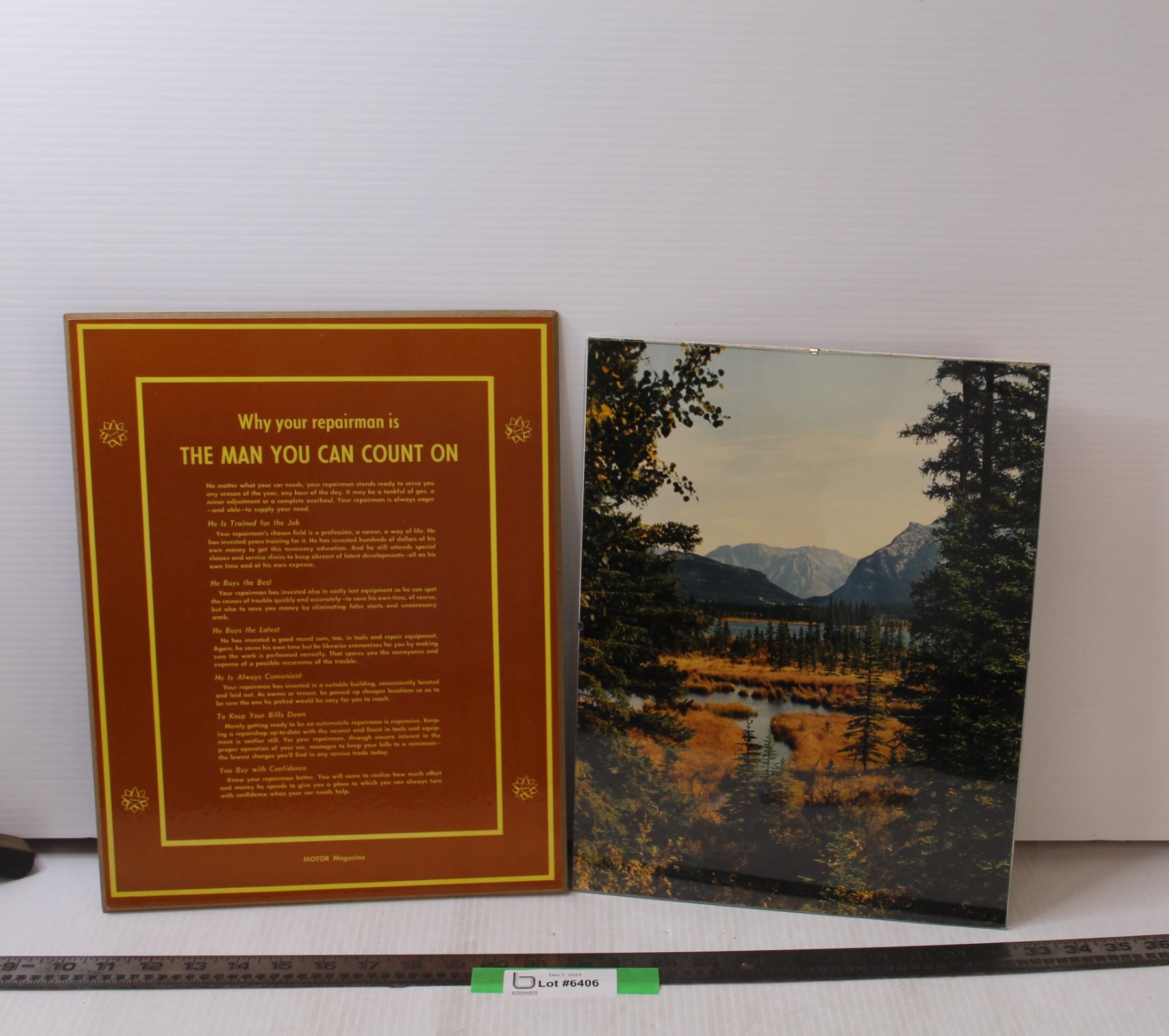 14.5" x 11.5" Reliable Repairman Sign, 14" x 11" Metal Clip Frame w/ Mountain Photo (One Clip is Missing)