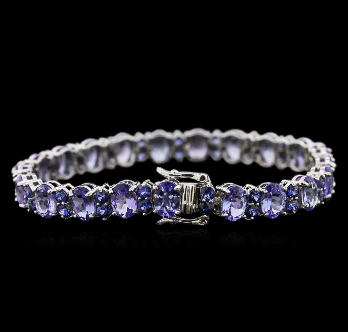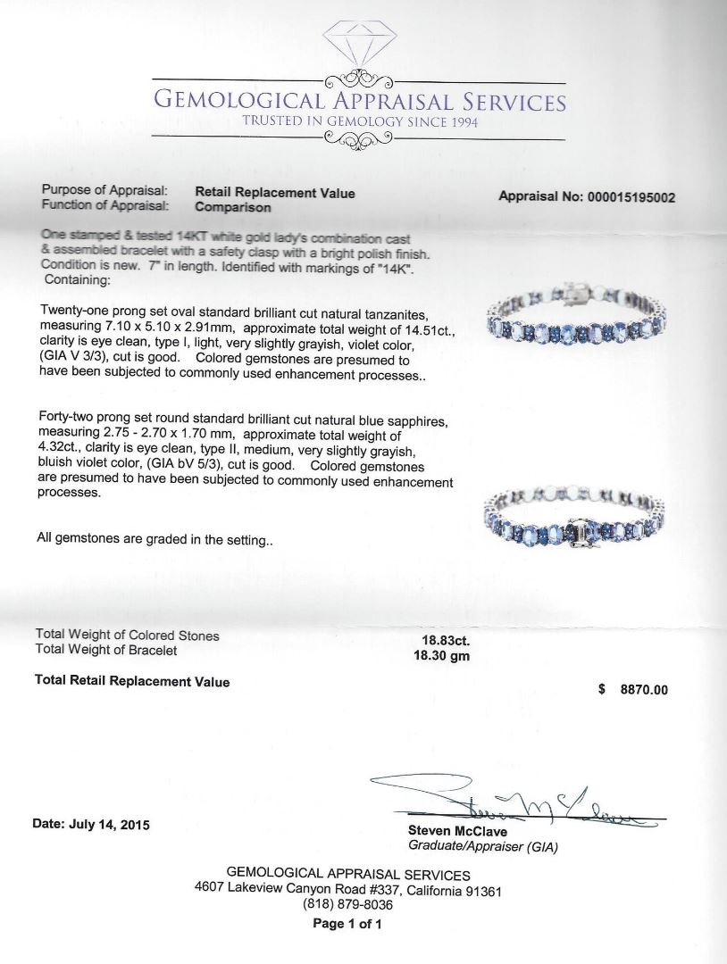 One stamped & tested 14KT white gold lady's combination cast & assembled bracelet with a safety clasp with a bright polish finish. Condition is new. 7" in length. Identified with markings of "14K". Containing: Twenty-one prong set oval standard brilliant cut natural tanzanites, measuring 7.10 x 5.10 x 2.91mm, approximate total weight of 14.51ct., clarity is eye clean, type I, light, very slightly grayish, violet color, (GIA V 3/3), cut is good. Colored gemstones are presumed to have been subjected to commonly used enhancement processes. Forty-two prong set round standard brilliant cut natural blue sapphires, measuring 2.75 - 2.70 x 1.70 mm, approximate total weight of 4.32ct., clarity is eye clean, type II, medium, very slightly grayish, blueish violet color, (GIA bV 5/3), cut is good. Colored gemstones are presumed to have been subjected to commonly used enhancement processes. All gemstones are graded in the setting. Total Weight of Colored Stones: 18.83ct. Total Weight of Bracelet: 18.30 gm. GAS Appraised at $8,870.00.