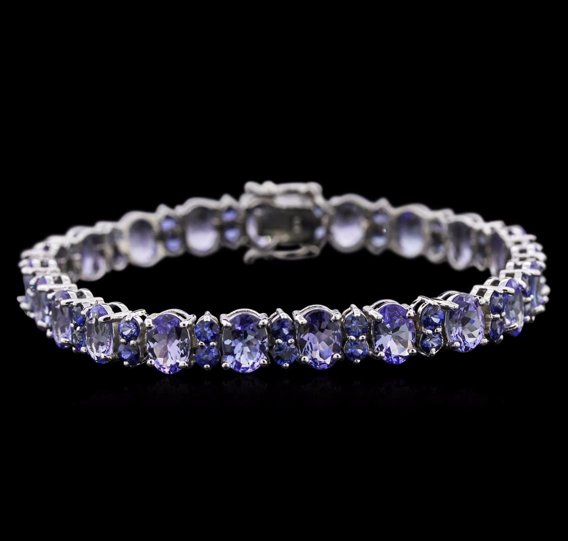 One stamped & tested 14KT white gold lady's combination cast & assembled bracelet with a safety clasp with a bright polish finish. Condition is new. 7" in length. Identified with markings of "14K". Containing: Twenty-one prong set oval standard brilliant cut natural tanzanites, measuring 7.10 x 5.10 x 2.91mm, approximate total weight of 14.51ct., clarity is eye clean, type I, light, very slightly grayish, violet color, (GIA V 3/3), cut is good. Colored gemstones are presumed to have been subjected to commonly used enhancement processes. Forty-two prong set round standard brilliant cut natural blue sapphires, measuring 2.75 - 2.70 x 1.70 mm, approximate total weight of 4.32ct., clarity is eye clean, type II, medium, very slightly grayish, blueish violet color, (GIA bV 5/3), cut is good. Colored gemstones are presumed to have been subjected to commonly used enhancement processes. All gemstones are graded in the setting. Total Weight of Colored Stones: 18.83ct. Total Weight of Bracelet: 18.30 gm. GAS Appraised at $8,870.00.