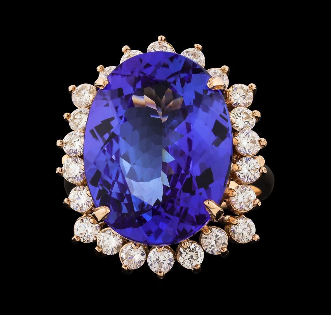 One electronically tested 14KT rose gold lady's cast fashion ring with a staggered basket halo with a bright polish finish. The featured lady's ring has a shank measuring 2.85 millimeters wide. Identified with markings of 'K14'. Condition is new, good workmanship. Containing: One prong set oval modified brilliant cut natural tanzanite, measuring 18.30 x 13.90 x 7.80mm, (depth est.) 5%. bulge factor, approximate weight of 14.54ct., clarity is eye clean, medium, moderately strong, violetish blue color, (GIA vB 5/4), cut is very good. Transmitting light with no distortion, transparent. Colored gemstones are presumed to have been subjected to commonly used enhancement processes. Graded in the setting. Twenty-Two prong set round brilliant cut diamonds, measuring 2.50 - 2.40 x 1.52mm (depth est.) approximate total weight of 22 Stones = 1.22ct. Graded in the setting. Clarity SI-1 to I-1. Color: G - H Cut Good. Total Weight of Colored Stones 14.54ct.. Total Weight of Diamonds 1.22ct.. Total Weight of Ring 9.40gm. GAS Appraised at $24,505.00.