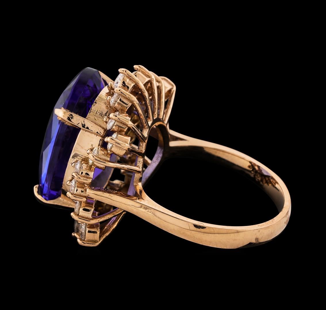 One electronically tested 14KT rose gold lady's cast fashion ring with a staggered basket halo with a bright polish finish. The featured lady's ring has a shank measuring 2.85 millimeters wide. Identified with markings of 'K14'. Condition is new, good workmanship. Containing: One prong set oval modified brilliant cut natural tanzanite, measuring 18.30 x 13.90 x 7.80mm, (depth est.) 5%. bulge factor, approximate weight of 14.54ct., clarity is eye clean, medium, moderately strong, violetish blue color, (GIA vB 5/4), cut is very good. Transmitting light with no distortion, transparent. Colored gemstones are presumed to have been subjected to commonly used enhancement processes. Graded in the setting. Twenty-Two prong set round brilliant cut diamonds, measuring 2.50 - 2.40 x 1.52mm (depth est.) approximate total weight of 22 Stones = 1.22ct. Graded in the setting. Clarity SI-1 to I-1. Color: G - H Cut Good. Total Weight of Colored Stones 14.54ct.. Total Weight of Diamonds 1.22ct.. Total Weight of Ring 9.40gm. GAS Appraised at $24,505.00.