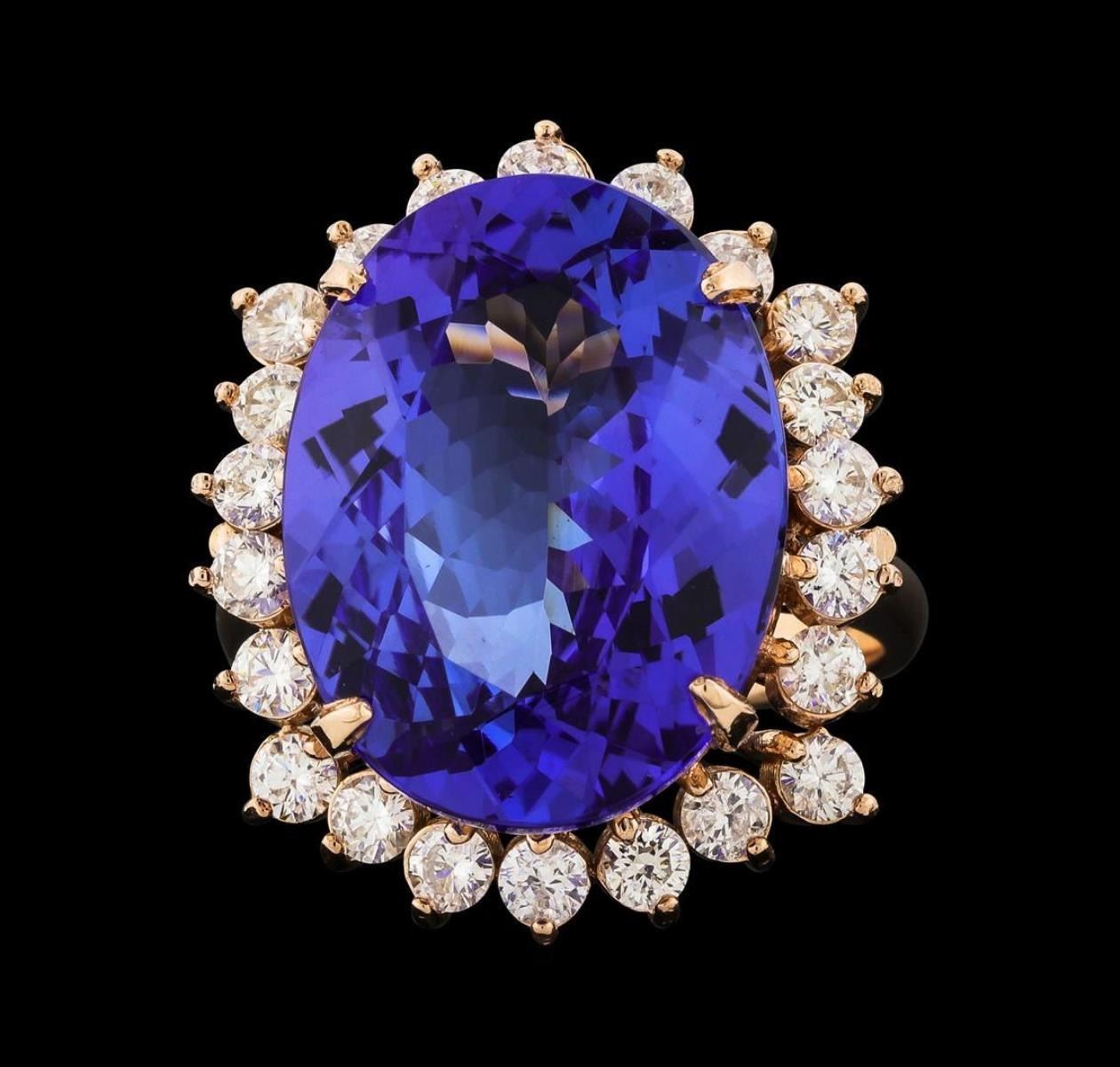 One electronically tested 14KT rose gold lady's cast fashion ring with a staggered basket halo with a bright polish finish. The featured lady's ring has a shank measuring 2.85 millimeters wide. Identified with markings of 'K14'. Condition is new, good workmanship. Containing: One prong set oval modified brilliant cut natural tanzanite, measuring 18.30 x 13.90 x 7.80mm, (depth est.) 5%. bulge factor, approximate weight of 14.54ct., clarity is eye clean, medium, moderately strong, violetish blue color, (GIA vB 5/4), cut is very good. Transmitting light with no distortion, transparent. Colored gemstones are presumed to have been subjected to commonly used enhancement processes. Graded in the setting. Twenty-Two prong set round brilliant cut diamonds, measuring 2.50 - 2.40 x 1.52mm (depth est.) approximate total weight of 22 Stones = 1.22ct. Graded in the setting. Clarity SI-1 to I-1. Color: G - H Cut Good. Total Weight of Colored Stones 14.54ct.. Total Weight of Diamonds 1.22ct.. Total Weight of Ring 9.40gm. GAS Appraised.