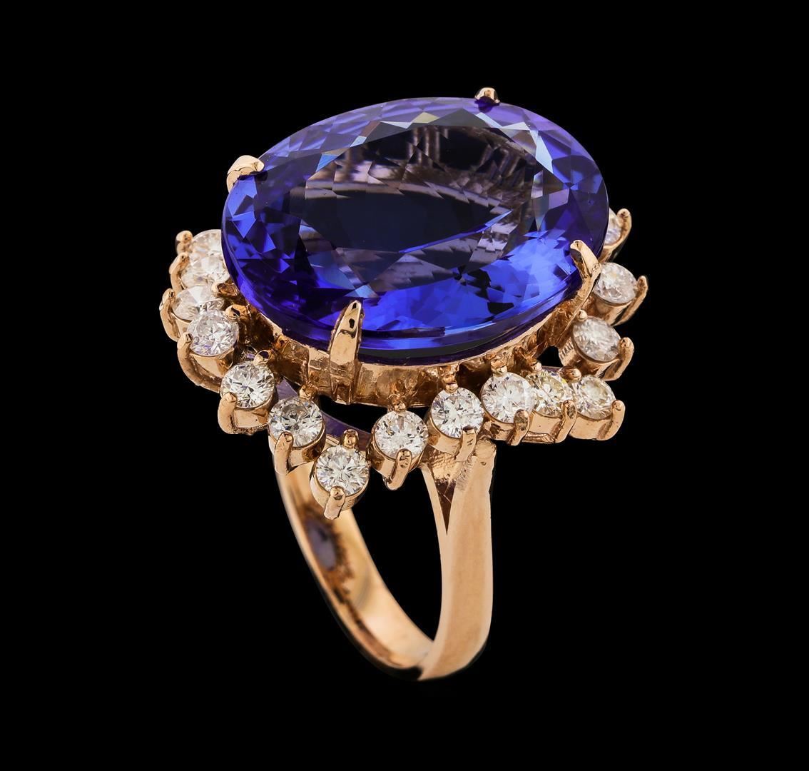 One electronically tested 14KT rose gold lady's cast fashion ring with a staggered basket halo with a bright polish finish. The featured lady's ring has a shank measuring 2.85 millimeters wide. Identified with markings of 'K14'. Condition is new, good workmanship. Containing: One prong set oval modified brilliant cut natural tanzanite, measuring 18.30 x 13.90 x 7.80mm, (depth est.) 5%. bulge factor, approximate weight of 14.54ct., clarity is eye clean, medium, moderately strong, violetish blue color, (GIA vB 5/4), cut is very good. Transmitting light with no distortion, transparent. Colored gemstones are presumed to have been subjected to commonly used enhancement processes. Graded in the setting. Twenty-Two prong set round brilliant cut diamonds, measuring 2.50 - 2.40 x 1.52mm (depth est.) approximate total weight of 22 Stones = 1.22ct. Graded in the setting. Clarity SI-1 to I-1. Color: G - H Cut Good. Total Weight of Colored Stones 14.54ct.. Total Weight of Diamonds 1.22ct.. Total Weight of Ring 9.40gm. GAS Appraised.