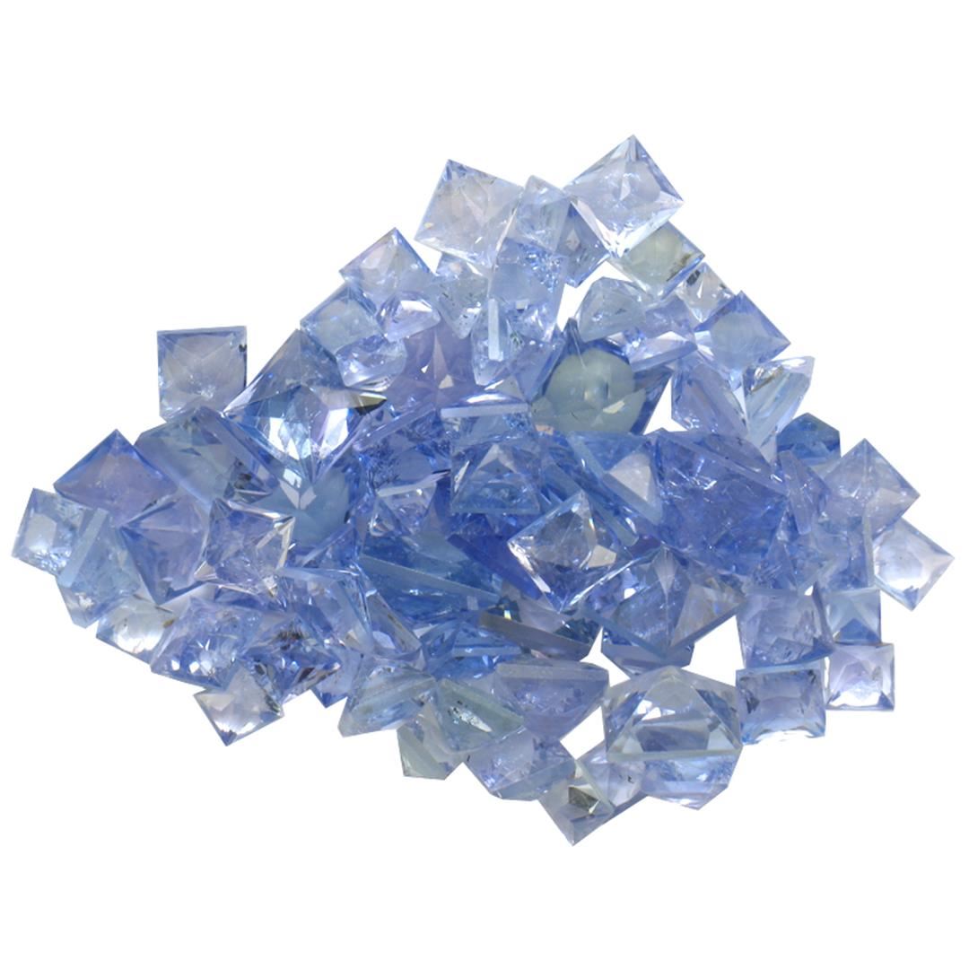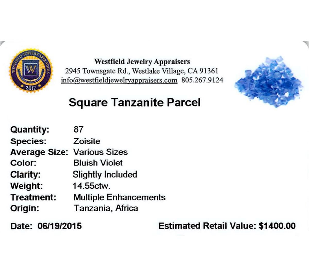 Eighty-seven square mixed cut natural tanzanites exact total weight 14.55ct., clarity is slightly included, type I, medium dark, very slightly grayish, bluish violet color, (GIA bV 6/3), cut is good. Transmitting light with a minimum of distortion, transparent. Naturally occurring internal & external characteristics are present. Color grade is an average for the group. Tanzanite is a very rare gemstone that is only found in the country of Tanzania. Originally discovered in 1967. Tiffany & Company, named the stone Tanzanite. It is found in the Usumburu Mountains that border the Umba Valley of northern Tanzania. Tanzanite occurs in gray, brown, violet, blue, reddish-purple, & green. The gem is interesting because of its exceptional pleochroism. Rotated in different directions a tanzanite will exhibit multiple changes of color. Tanzanite has a low tolerance to ultrasonic cleaning, and should not be cleaned using this method. Westfield Appraised at $1,400.00.
