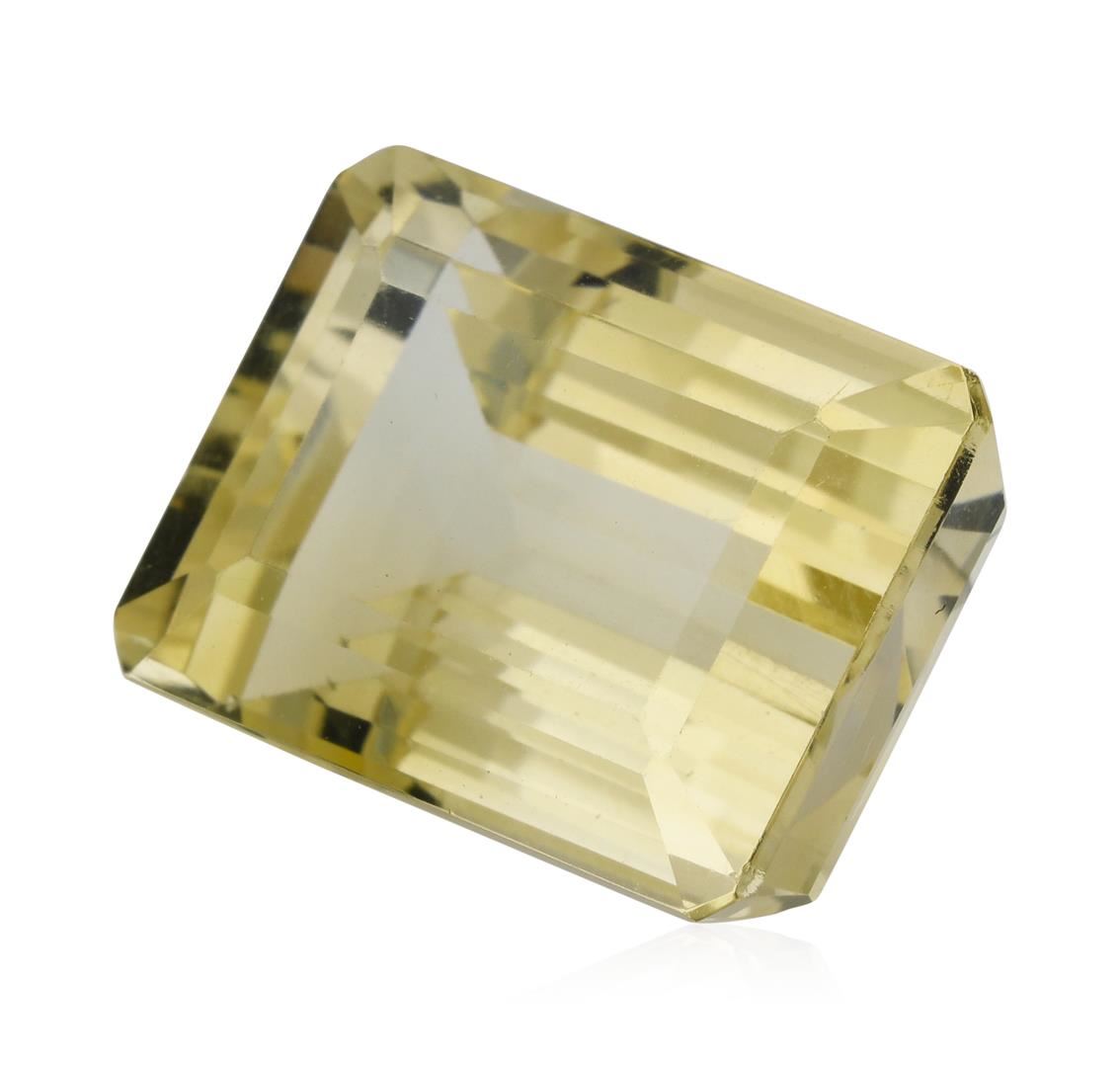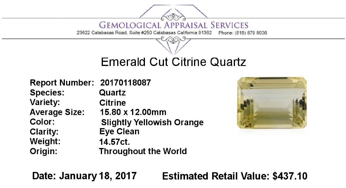 One natural emerald cut citrine quartz with an exact weight of 14.57ct., clarity is eye clean, slightly yellowish orange. Gemological Appraisals Services estimates the retail value at $437.1 GAS Appraised.