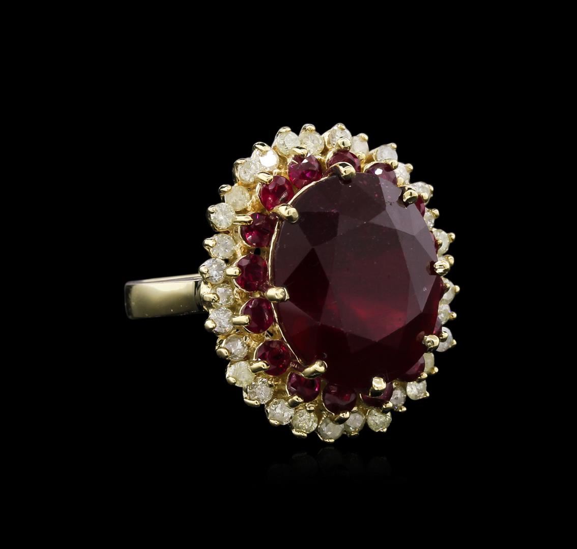 Fourteen karat (14K) yellow gold ruby and diamond ring. An oval cut ruby corundum gemstone is prong mounted in the center of the ring. Round brilliant cut diamonds accent the ring around the center gemstone. The ring is cast stamped "14K" and has a gross weight of 10.1 Grams. Diamond(s): Shape: Round Brilliant Cut. Weight: 0.77 carat (32pcs). Average Clarity: I1-I2. Average Color: H-J. Symmetry: Very Good. Polish: Very Good. GemStone(s): Ruby Corundum. Nature: Natural. Shape: Oval, Faceted. Quantity: 17, Mounted 1 (Center and 11 Side Stones). Weight: 14.57 carat total (13.32ctw. Center and 1.25ctw. Side Stones). Dimensions: Length- 14.50 mm. ; Width 12.18 mm. Bulge: Visible. Clarity: SI, Type 3. Color: Red (5/5). Symmetry: Very Good. Color Intensity: Medium. Transparency: Transparent. Tone: Dark. Enhancements: Indications of high temperature heat treatment, with glass and flux additives. Metal(s): Metal: Gold, Stamped. Purity: 14K. Color: Yellow. Condition: Excellent. Finish: High polish. GGA Appraised at $6,630.00.