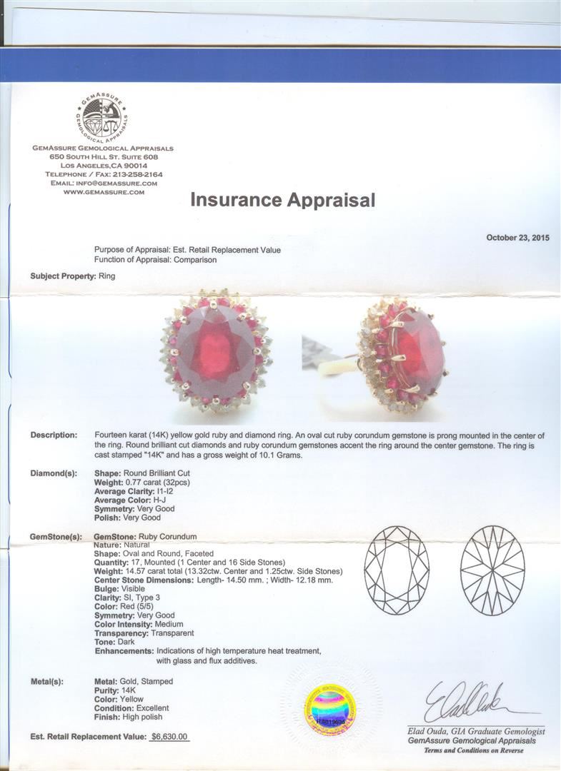 Fourteen karat (14K) yellow gold ruby and diamond ring. An oval cut ruby corundum gemstone is prong mounted in the center of the ring. Round brilliant cut diamonds accent the ring around the center gemstone. The ring is cast stamped "14K" and has a gross weight of 10.1 Grams. Diamond(s): Shape: Round Brilliant Cut. Weight: 0.77 carat (32pcs). Average Clarity: I1-I2. Average Color: H-J. Symmetry: Very Good. Polish: Very Good. GemStone(s): Ruby Corundum. Nature: Natural. Shape: Oval, Faceted. Quantity: 17, Mounted 1 (Center and 11 Side Stones). Weight: 14.57 carat total (13.32ctw. Center and 1.25ctw. Side Stones). Dimensions: Length- 14.50 mm. ; Width 12.18 mm. Bulge: Visible. Clarity: SI, Type 3. Color: Red (5/5). Symmetry: Very Good. Color Intensity: Medium. Transparency: Transparent. Tone: Dark. Enhancements: Indications of high temperature heat treatment, with glass and flux additives. Metal(s): Metal: Gold, Stamped. Purity: 14K. Color: Yellow. Condition: Excellent. Finish: High polish. GGA Appraised at $6,630.00.