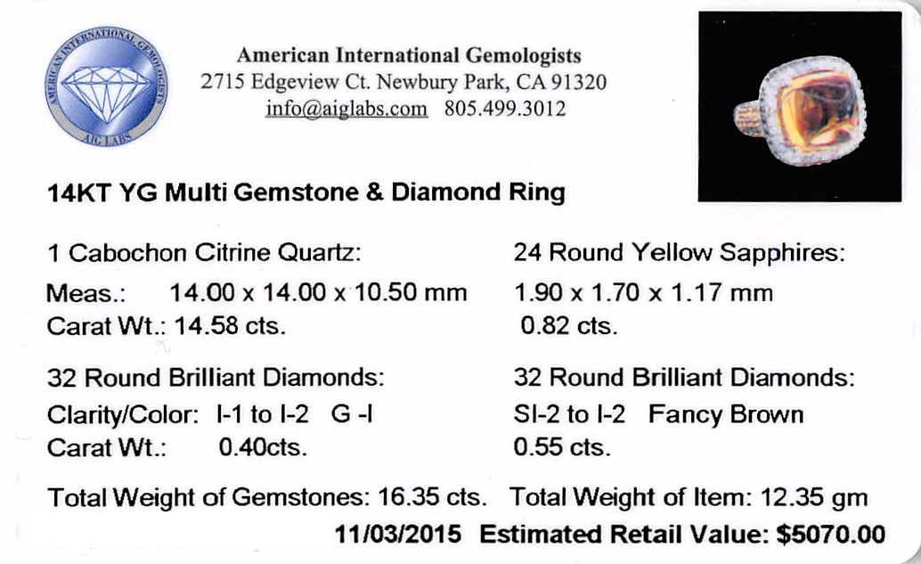 One Citrine, Yellow Sapphire and Diamond Ring featuring: 1 Cabochon Citrine Quartz: Measures: 14.00 x 14.00 x 10.50 mm. Carat Weight: 14.58cts. 32 Round Brilliant Diamonds: Clarity/Color: I-1 to I-2 G-I. Carat Weight: 0.40cts. 24 Round Yellow Sapphires: Measures 1.90 x 1.70 x 1.17 mm. Carat Weight: 0.82cts. 32 Round Brilliant Diamonds: Clarity/Color: SI-2 to I-2 Fancy Brown. Carat Weight: 0.55cts. Total Weight of Gemstone: 16.35cts. Total Weight of Item: 12.35gm. AIG Appraised at $5,070.00.