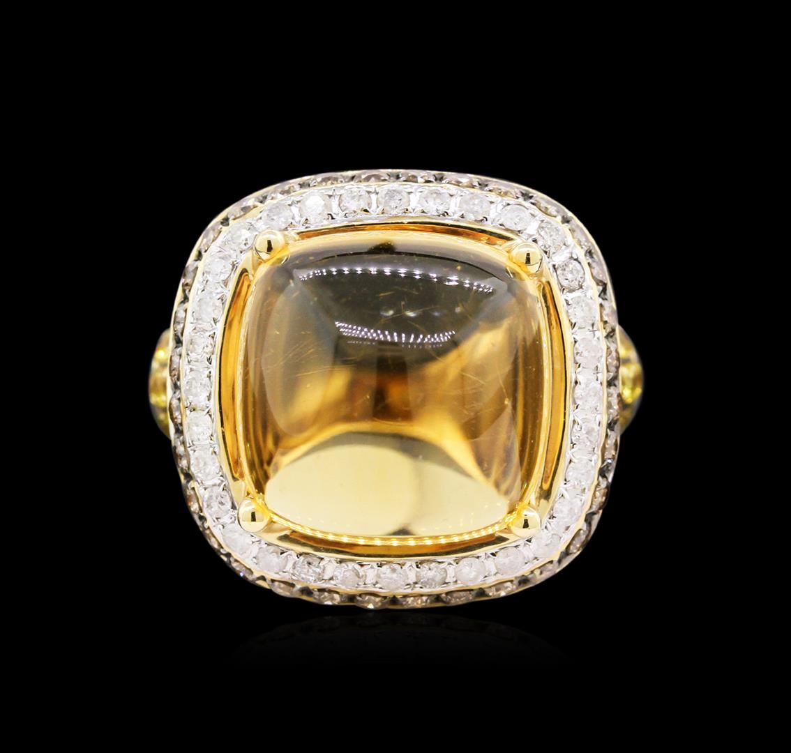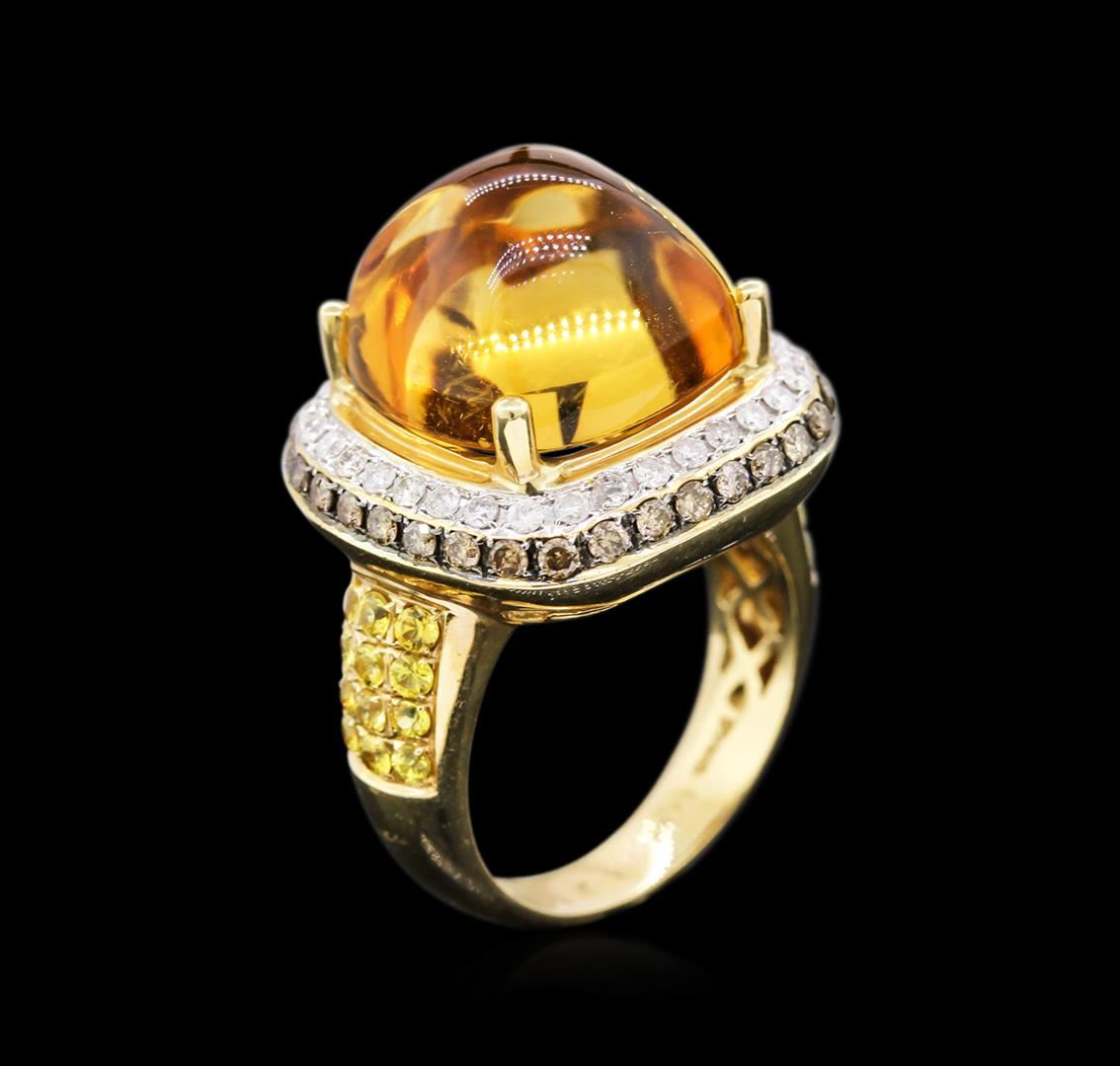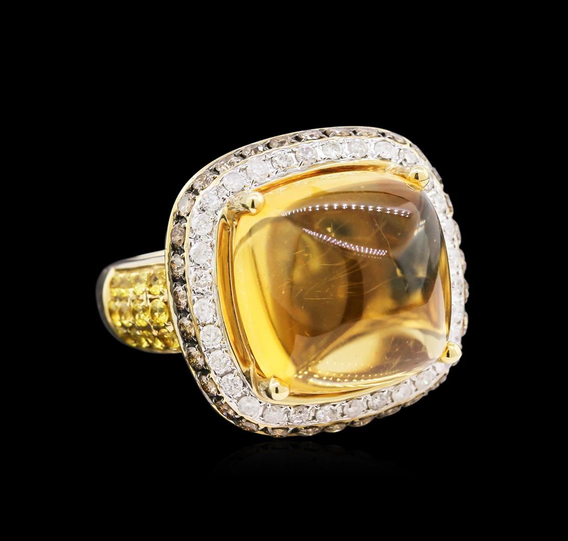 One Citrine, Yellow Sapphire and Diamond Ring featuring: 1 Cabochon Citrine Quartz: Measures: 14.00 x 14.00 x 10.50 mm. Carat Weight: 14.58cts. 32 Round Brilliant Diamonds: Clarity/Color: I-1 to I-2 G-I. Carat Weight: 0.40cts. 24 Round Yellow Sapphires: Measures 1.90 x 1.70 x 1.17 mm. Carat Weight: 0.82cts. 32 Round Brilliant Diamonds: Clarity/Color: SI-2 to I-2 Fancy Brown. Carat Weight: 0.55cts. Total Weight of Gemstone: 16.35cts. Total Weight of Item: 12.35gm. AIG Appraised at $5,070.00.