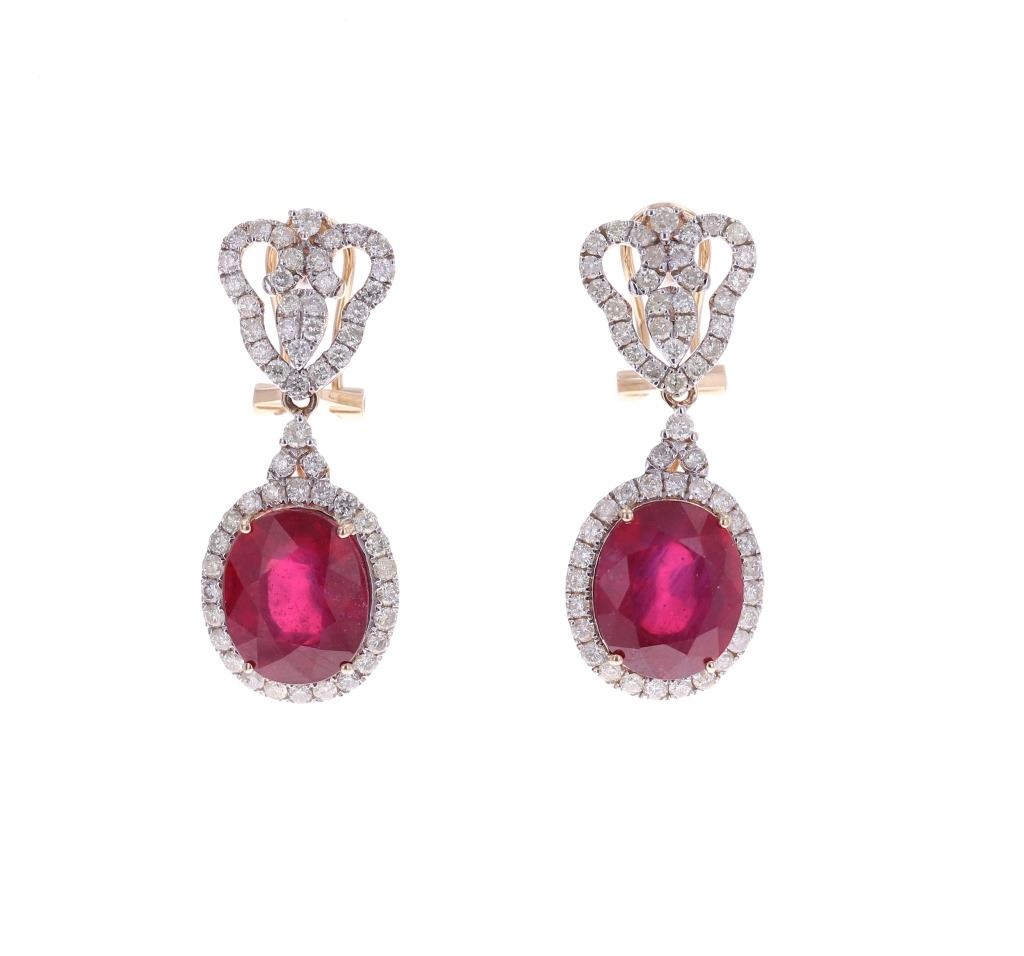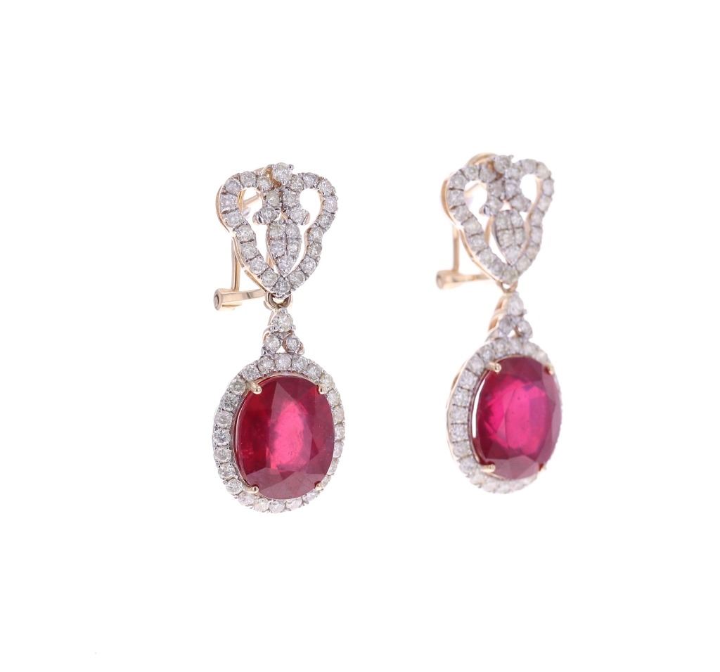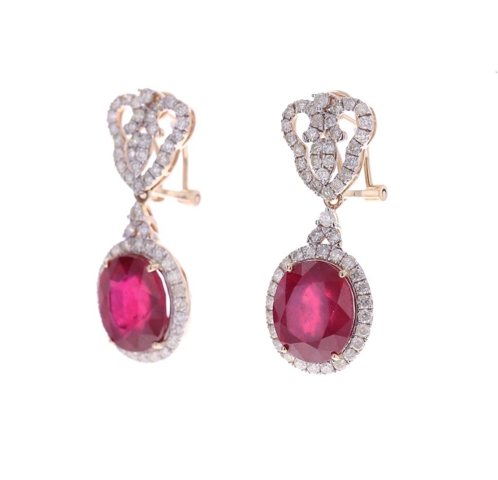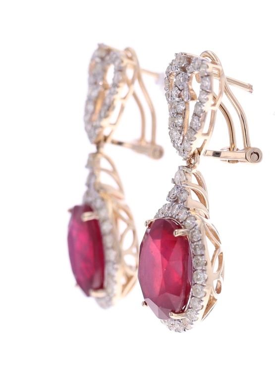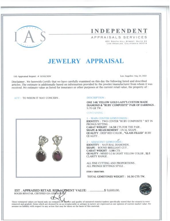 Featured in this lot is this 14.58ct ruby dimaond and 14k yellow gold earrings with IAS paperwork. The earrings show polished, stamped and tested 14k yellow gold construction that shows markings of 'Oscar Friedman' '14k.' The centerstone's of these earrings are oval cut rubies with a deep red color quality and shows glass filled ruby quality and a total weight of 14.58 carats. The center stone and the top of the dangle earrings where the stud is are decorated with round brilliant cut diamonds that shows I - J light yellow coloration that shows a clarity of SI - I and a total diamond weight of 1.98cts. The piece comes complete with IAS(Independent Appraisals Services, a GIA certified lab IAS Appraisal Number#: 165623EW) report and appraisal confirming the above info and giving a total value of $9,600.00. The overall measurements of this of these earrings is 1 1/4" x 5/8" x 1/2". ER007089.