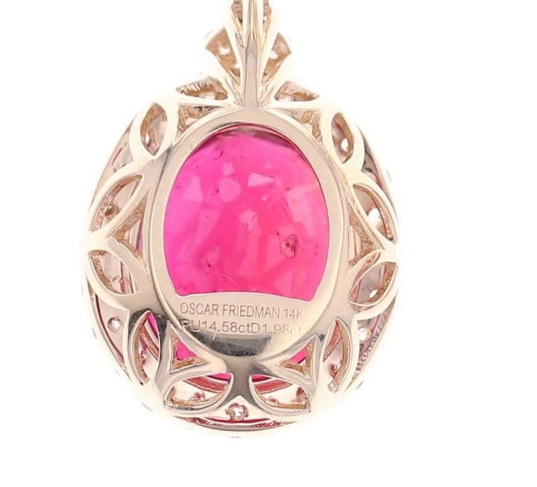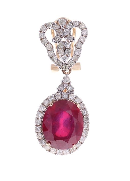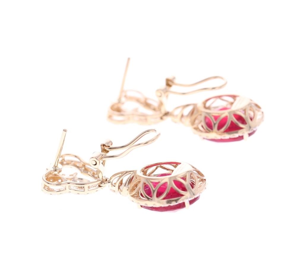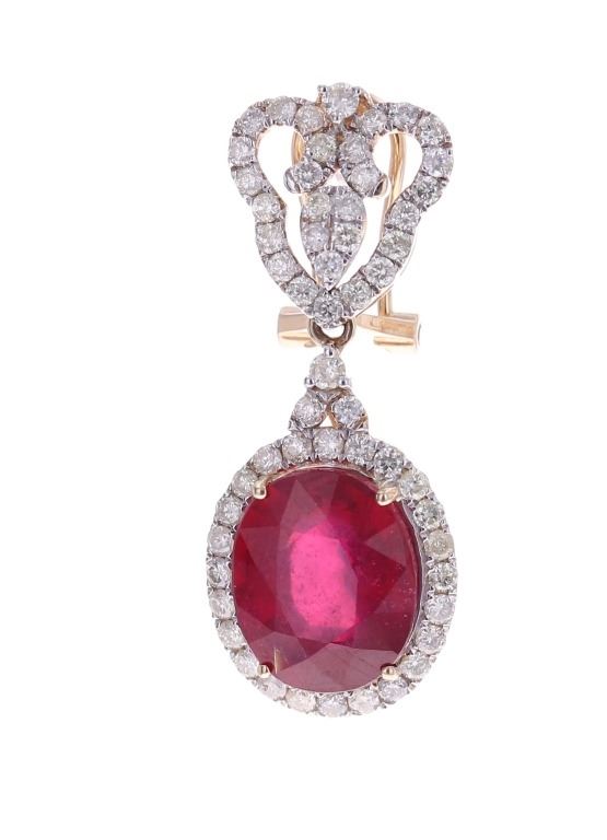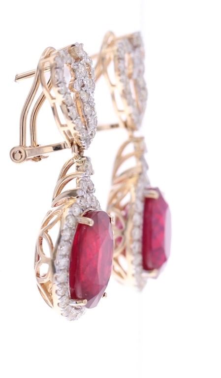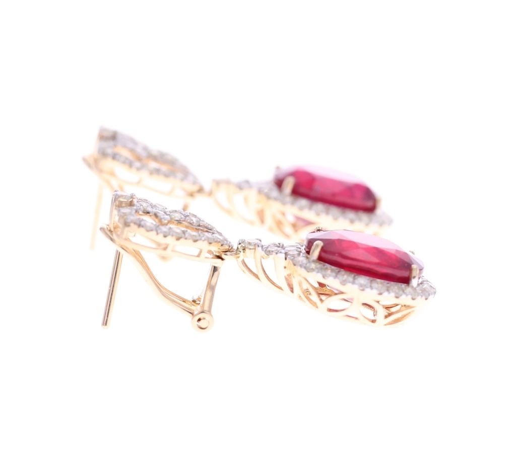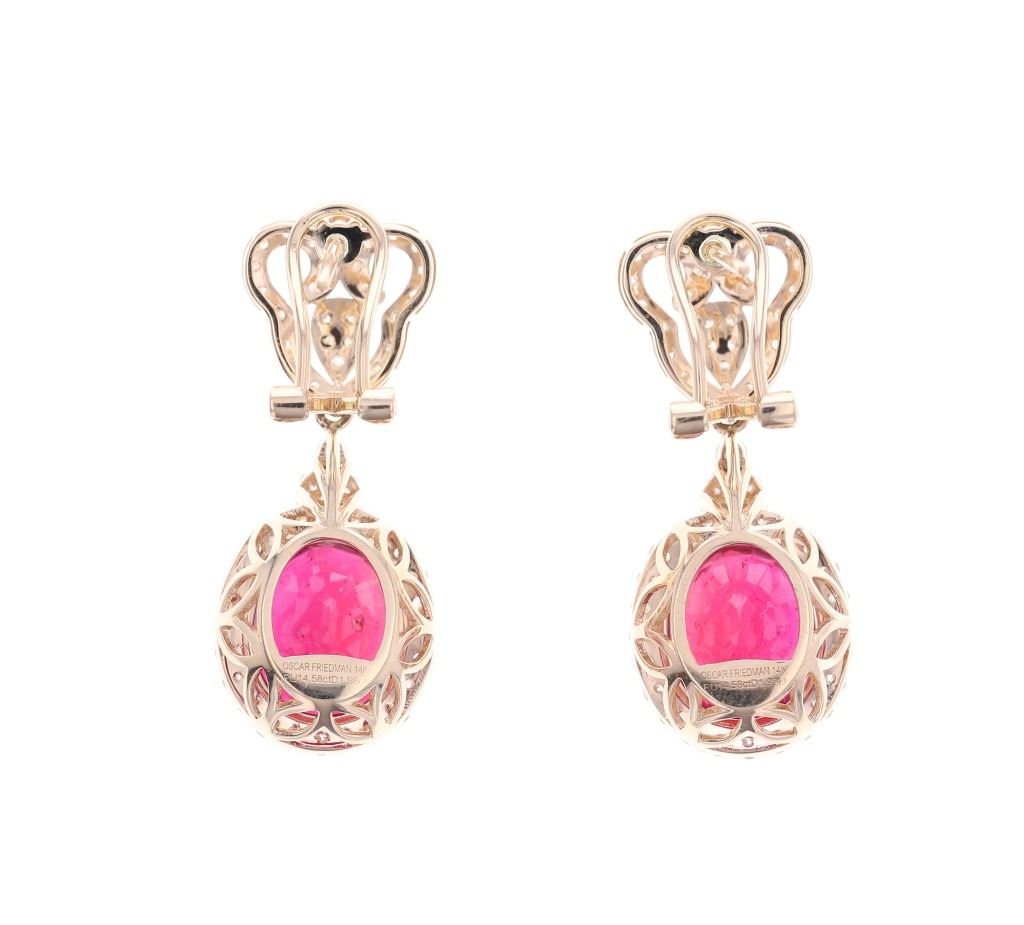 Featured in this lot is this 14.58ct ruby dimaond and 14k yellow gold earrings with IAS paperwork. The earrings show polished, stamped and tested 14k yellow gold construction that shows markings of 'Oscar Friedman' '14k.' The centerstone's of these earrings are oval cut rubies with a deep red color quality and shows glass filled ruby quality and a total weight of 14.58 carats. The center stone and the top of the dangle earrings where the stud is are decorated with round brilliant cut diamonds that shows I - J light yellow coloration that shows a clarity of SI - I and a total diamond weight of 1.98cts. The piece comes complete with IAS(Independent Appraisals Services, a GIA certified lab IAS Appraisal Number#: 165623EW) report and appraisal confirming the above info and giving a total value of $9,600.00. The overall measurements of this of these earrings is 1 1/4" x 5/8" x 1/2". ER007089.