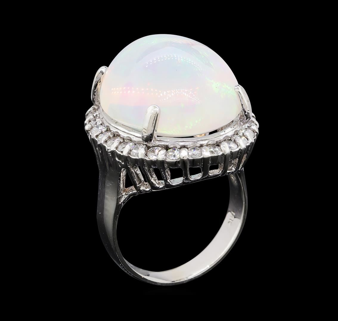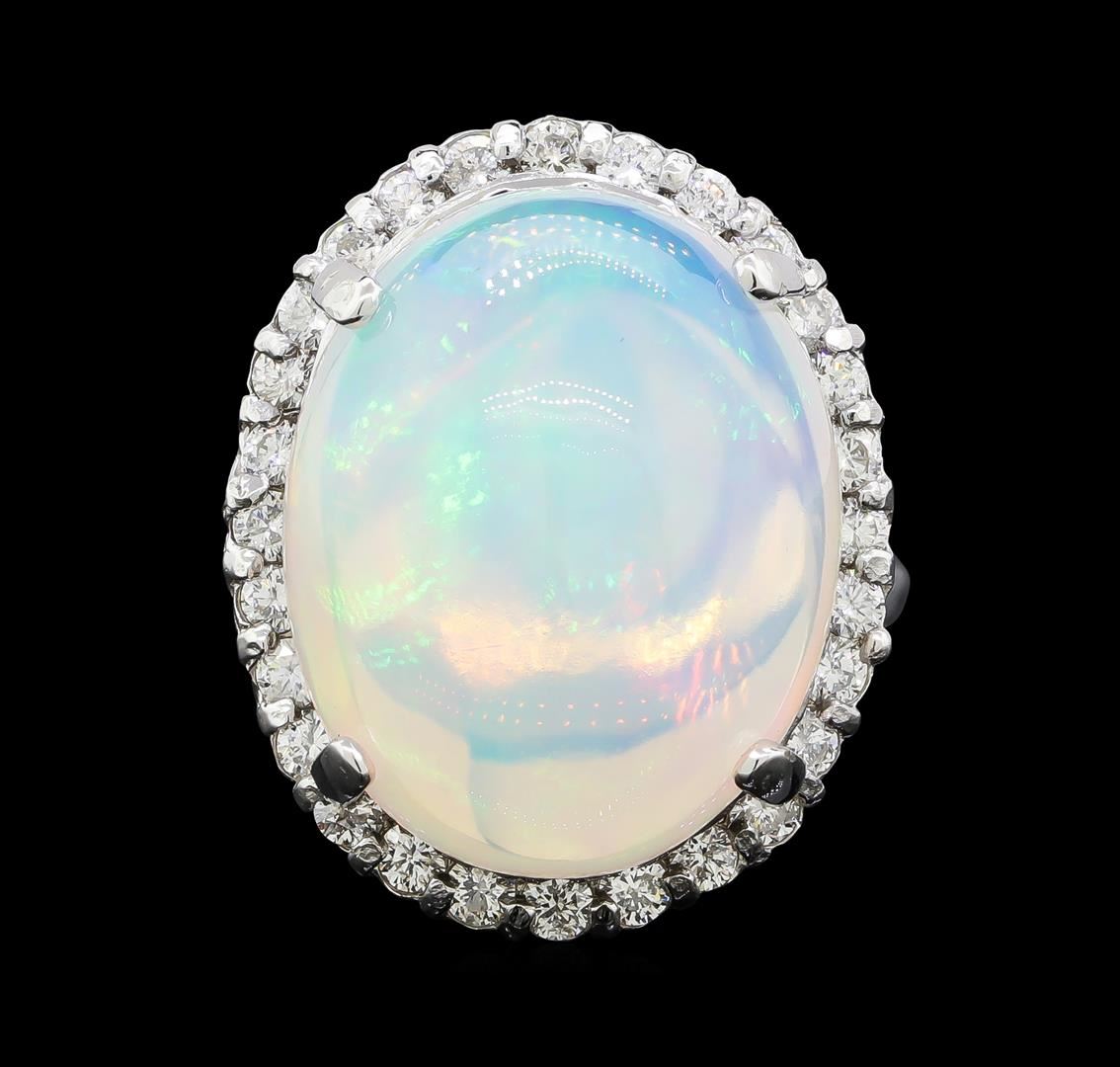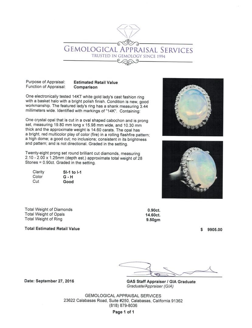 One electronically tested 14KT white gold lady's cast fashion ring with a basket halo with a bright polish finish. The featured lady's ring has a shank measuring 3.44 millimeters wide. Identified with markings of '14K'. Condition is new, good workmanship. Containing: One crystal opal that is cut in a oval shaped cabochon and is prong set, measuring 19.80 mm long x 15.98 mm wide, and 10.30 mm thick and the approximate weight is 14.60 carats. The opal has a bright, red multicolor play of color (fire) in a rolling flashfire pattern; a high dome; a good cut; no inclusions; consistent in its brightness and pattern; and is not directional. Graded in the setting. Twenty-Eight prong set round brilliant cut diamonds, measuring 2.10 - 2.00 x 1.25mm (depth est.) approximate total weight of 28 Stones = 0.90ct. Graded in the setting. Clarity SI-1 to I-1. Color: G - H Cut Good. Total Weight of Diamonds 0.90ct.. Total Weight of Opals 14.60ct.. Total Weight of Ring 9.50gm. GAS Appraised at $9,905.00.