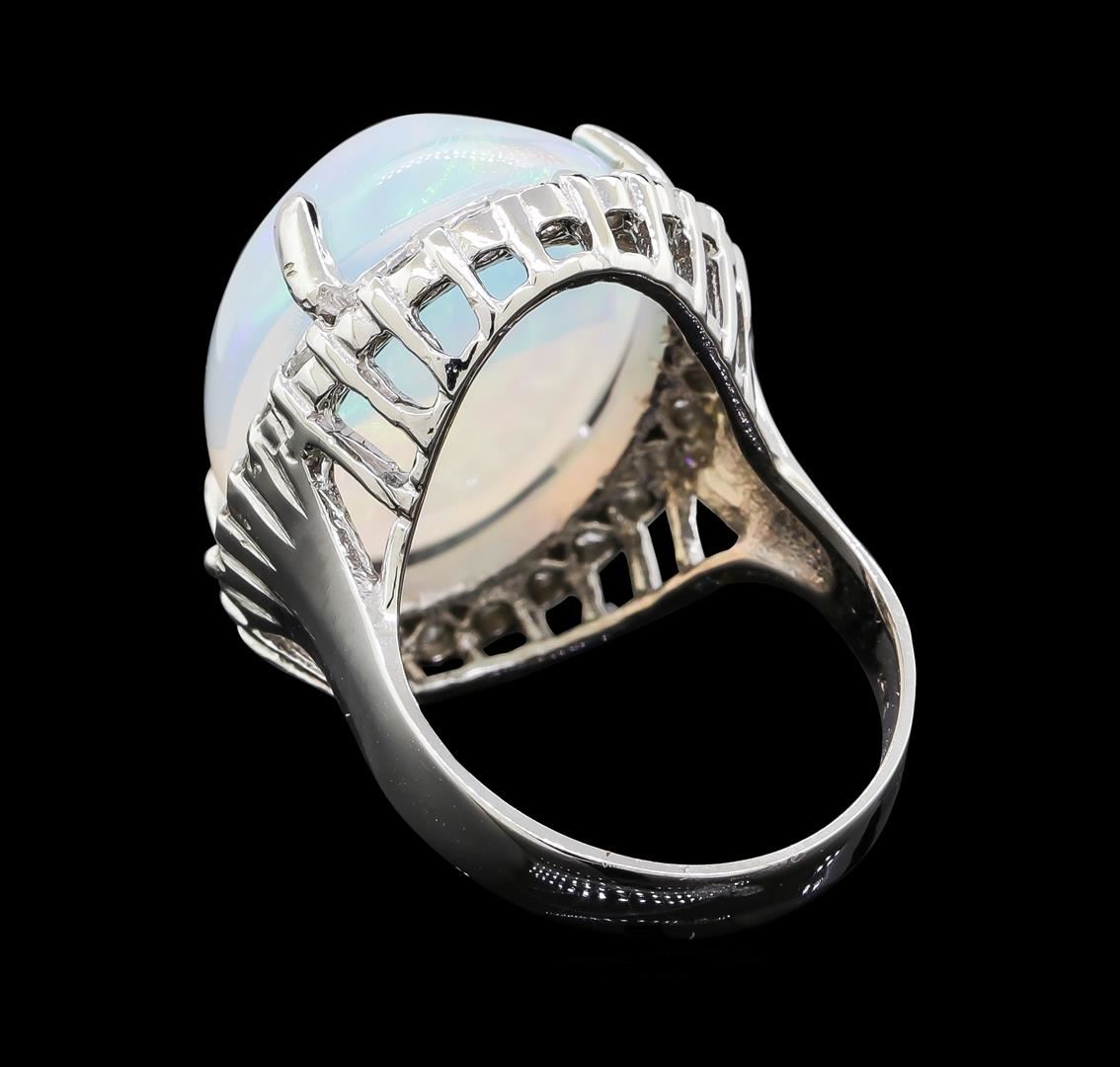 One electronically tested 14KT white gold lady's cast fashion ring with a basket halo with a bright polish finish. The featured lady's ring has a shank measuring 3.44 millimeters wide. Identified with markings of '14K'. Condition is new, good workmanship. Containing: One crystal opal that is cut in a oval shaped cabochon and is prong set, measuring 19.80 mm long x 15.98 mm wide, and 10.30 mm thick and the approximate weight is 14.60 carats. The opal has a bright, red multicolor play of color (fire) in a rolling flashfire pattern; a high dome; a good cut; no inclusions; consistent in its brightness and pattern; and is not directional. Graded in the setting. Twenty-Eight prong set round brilliant cut diamonds, measuring 2.10 - 2.00 x 1.25mm (depth est.) approximate total weight of 28 Stones = 0.90ct. Graded in the setting. Clarity SI-1 to I-1. Color: G - H Cut Good. Total Weight of Diamonds 0.90ct.. Total Weight of Opals 14.60ct.. Total Weight of Ring 9.50gm. GAS Appraised at $9,905.00.