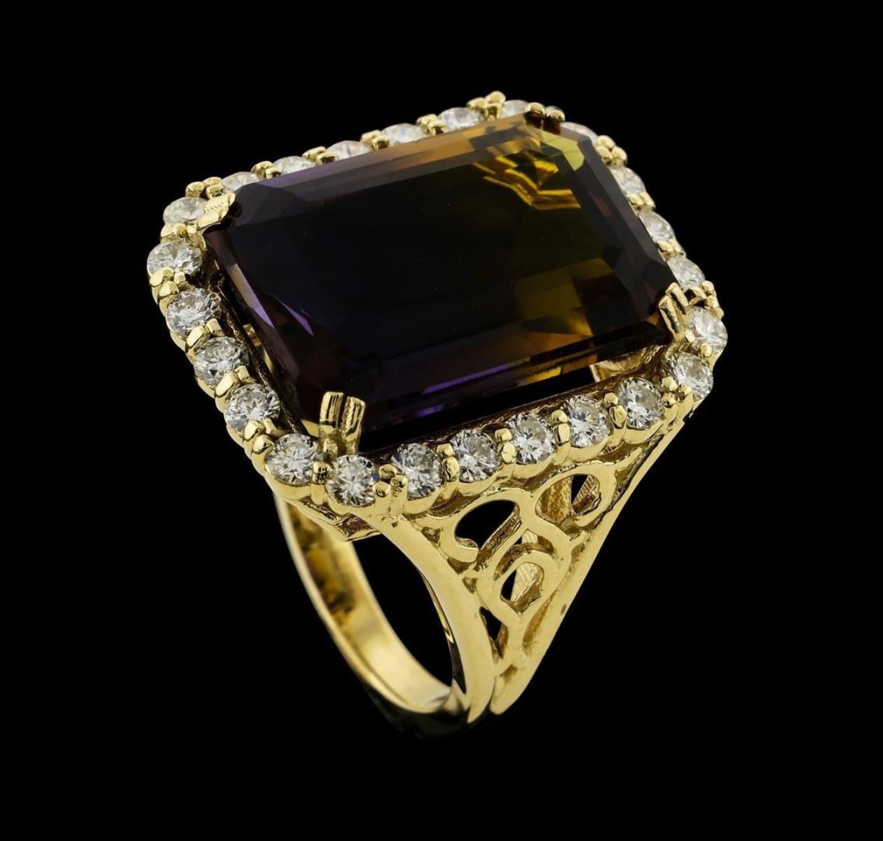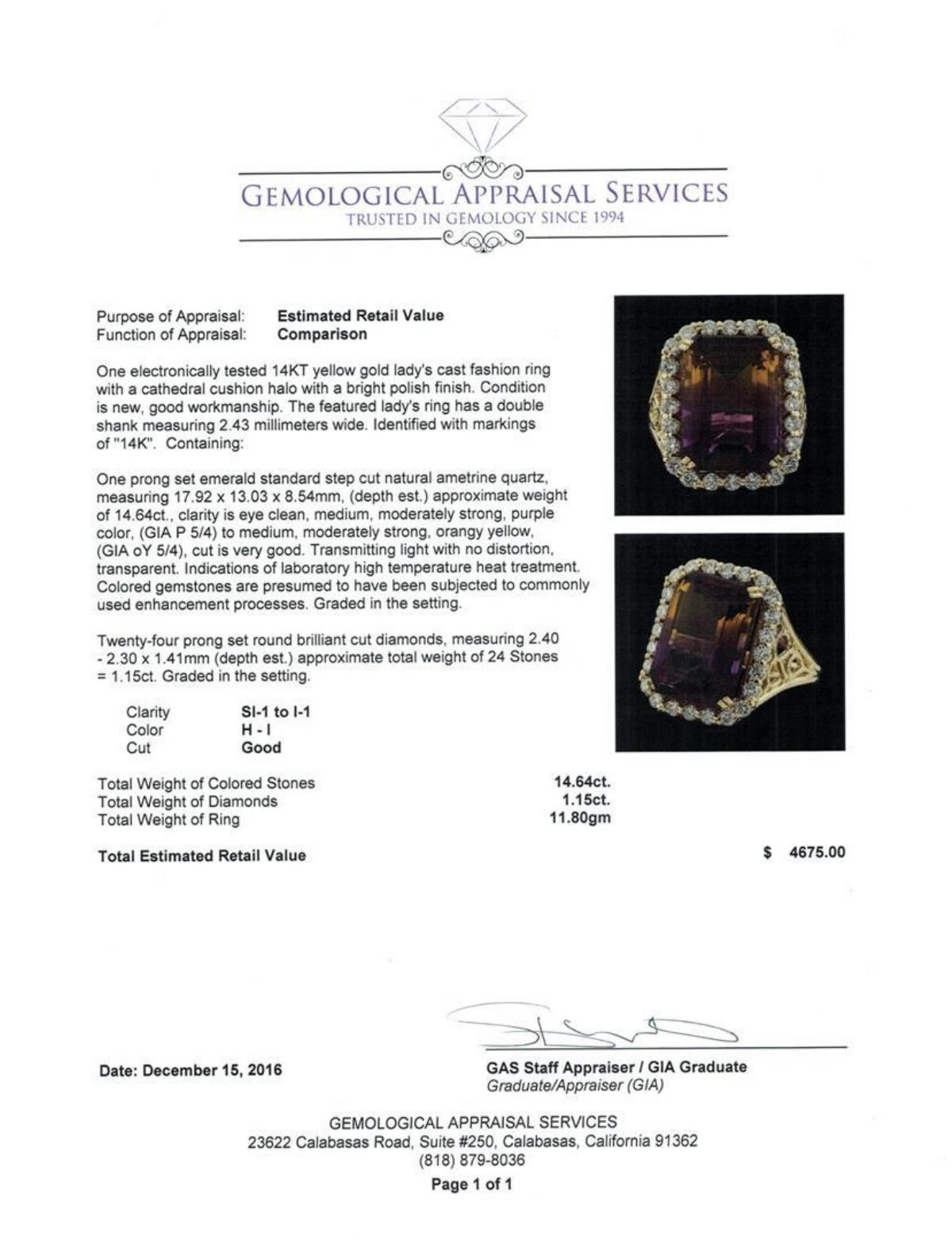 One electronically tested 14KT yellow gold lady's cast fashion ring with a cathedral cushion halo with a bright polish finish. The featured lady's ring has a double shank measuring 2.43 millimeters wide. Identified with markings of '14K'. Condition is new, good workmanship. Containing: One prong set emerald standard step cut natural ametrine quartz, measuring 17.92 x 13.03 x 8.54mm, (depth est.) approximate weight of 14.64ct., clarity is eye clean, medium, moderately strong, purple color, (GIA P 5/4) to medium, moderately strong, orangy yellow, (GIA oY 5/4), cut is very good. Transmitting light with no distortion, transparent. Indications of laboratory high temperature heat treatment. Colored gemstones are presumed to have been subjected to commonly used enhancement processes. Graded in the setting. Twenty-Four prong set round brilliant cut diamonds, measuring 2.40 - 2.30 x 1.41mm (depth est.) approximate total weight of 24 Stones = 1.15ct. Graded in the setting. Clarity SI-1 to I-1. Color: H - I Cut Good. Total Weight of Colored Stones 14.64ct.. Total Weight of Diamonds 1.15ct.. Total Weight of Ring 11.80gm. GAS Appraised.