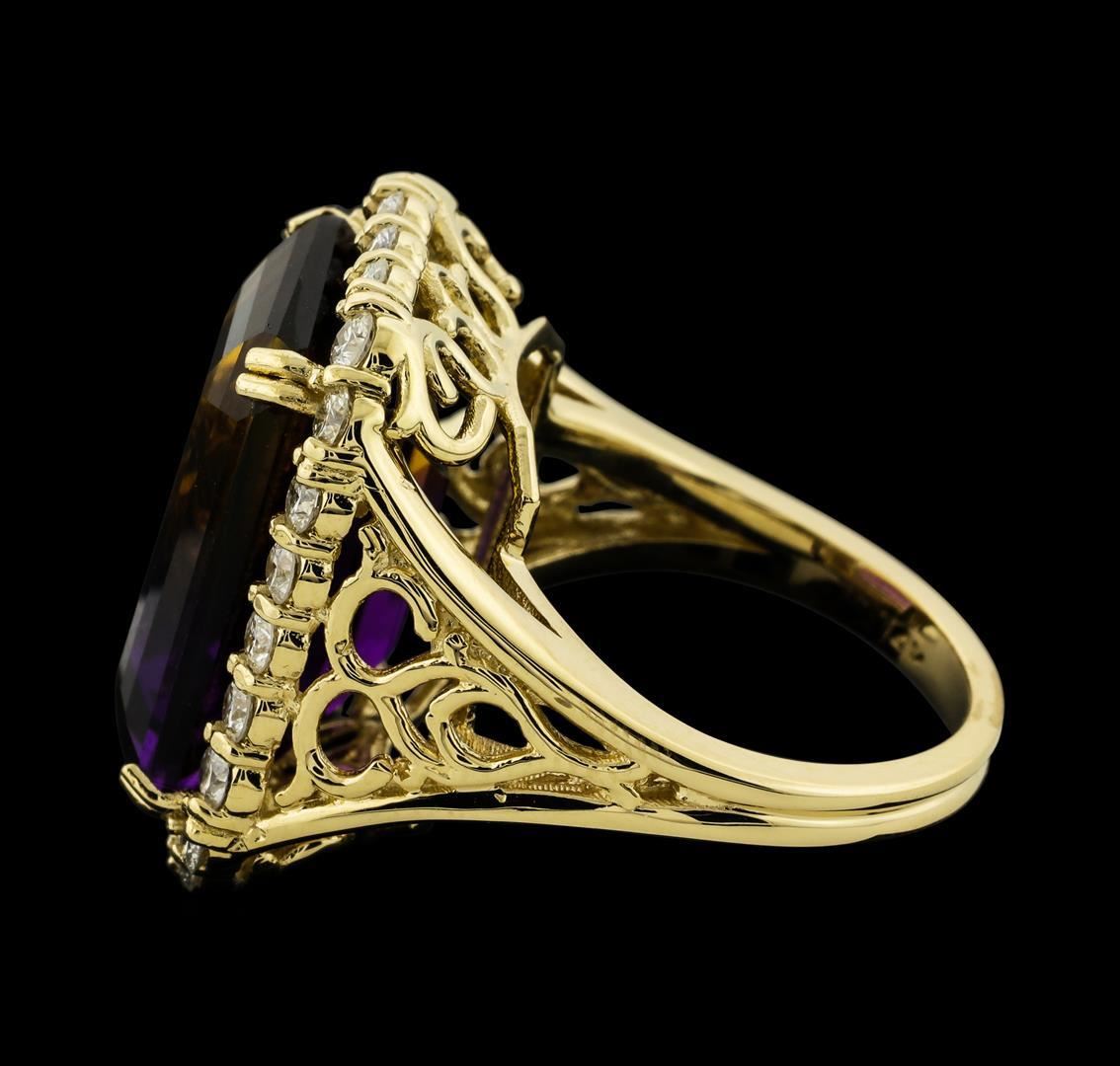 One electronically tested 14KT yellow gold lady's cast fashion ring with a cathedral cushion halo with a bright polish finish. The featured lady's ring has a double shank measuring 2.43 millimeters wide. Identified with markings of '14K'. Condition is new, good workmanship. Containing: One prong set emerald standard step cut natural ametrine quartz, measuring 17.92 x 13.03 x 8.54mm, (depth est.) approximate weight of 14.64ct., clarity is eye clean, medium, moderately strong, purple color, (GIA P 5/4) to medium, moderately strong, orangy yellow, (GIA oY 5/4), cut is very good. Transmitting light with no distortion, transparent. Indications of laboratory high temperature heat treatment. Colored gemstones are presumed to have been subjected to commonly used enhancement processes. Graded in the setting. Twenty-Four prong set round brilliant cut diamonds, measuring 2.40 - 2.30 x 1.41mm (depth est.) approximate total weight of 24 Stones = 1.15ct. Graded in the setting. Clarity SI-1 to I-1. Color: H - I Cut Good. Total Weight of Colored Stones 14.64ct.. Total Weight of Diamonds 1.15ct.. Total Weight of Ring 11.80gm. GAS Appraised.
