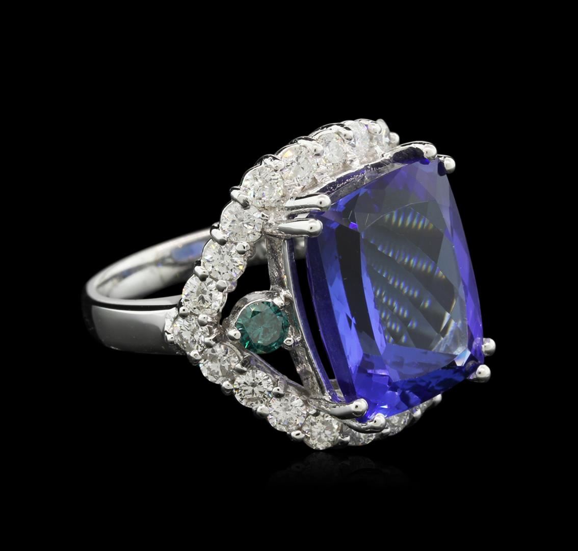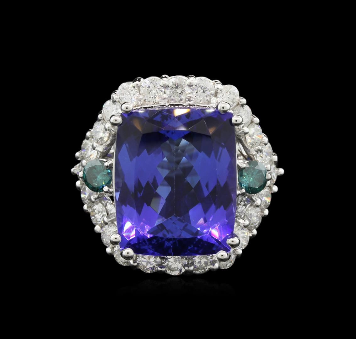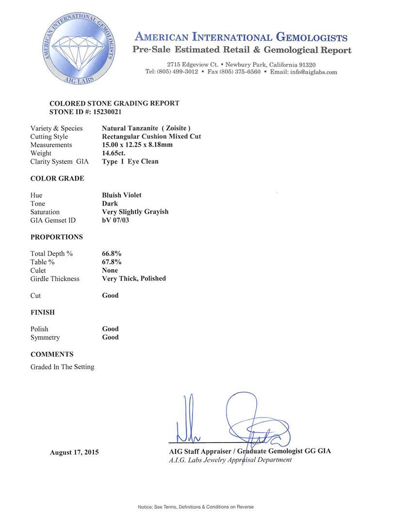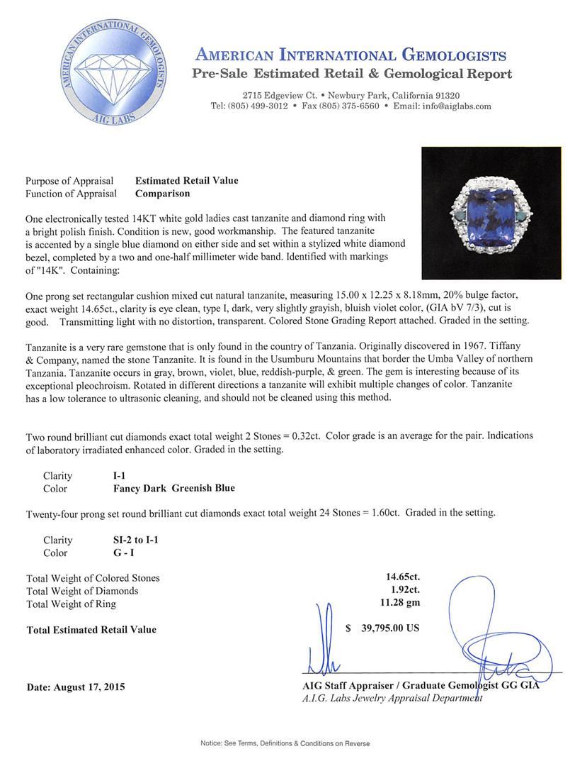 One electronically tested 14KT white gold ladies cast tanzanite and diamond ring with a bright polish finish. The featured tanzanite is accented by a single blue diamond on either side and set within a stylized white diamond bezel, completed by a two and one-half millimeter wide band. Identified with markings of "14K". Condition is new, good workmanship. Containing: One prong set rectangular cushion mixed cut natural tanzanite, measuring 15.00 x 12.25 x 8.18mm, 20% bulge factor, exact weight 14.65ct., clarity is eye clean, type I, dark, very slightly grayish, bluish violet color, (GIA bV 7/3), cut is good. Transmitting light with no distortion, transparent. Colored Stone Grading Report attached. Graded in the setting. Tanzanite is a very rare gemstone that is only found in the country of Tanzania. Originally discovered in 1967. Tiffany & Company, named the stone Tanzanite. It is found in the Usumburu Mountains that border the Umba Valley of northern Tanzania. Tanzanite occurs in gray, brown, violet, blue, reddish-purple, & green. The gem is interesting because of its exceptional pleochroism. Rotated in different directions a tanzanite will exhibit multiple changes of color. Tanzanite has a low tolerance to ultrasonic cleaning, and should not be cleaned using this method. Two round brilliant cut diamonds exact total weight 2 Stones = 0.32ct. Color grade is an average for the pair. Indications of laboratory irradiated enhanced color. Graded in the setting. Clarity: I-1 Twenty-Four prong set round brilliant cut diamonds exact total weight 24 Stones = 1.60ct. Graded in the setting. Clarity: SI-2 to I-1. Color: G - I. Total Weight of Colored Stones 14.65ct. Total Weight of Diamonds 1.92ct. Total Weight of Ring 11.28gm. AIG Appraised at $39,795.00.