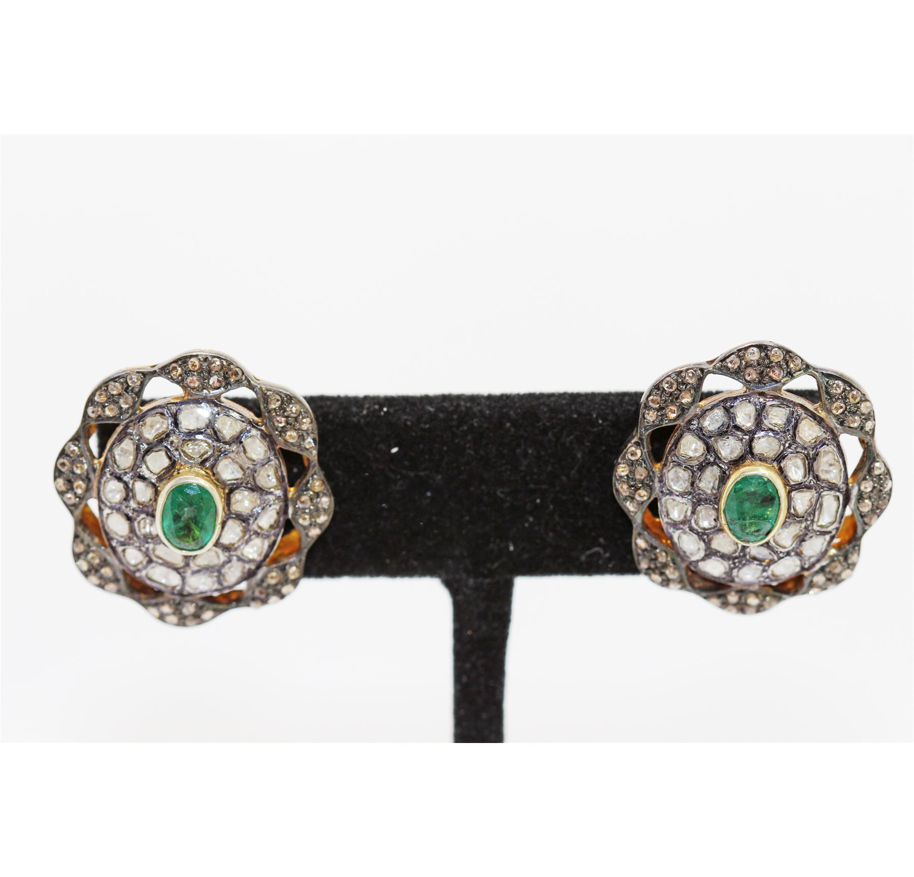 14.66gm Gold Plated / Silver / Emerald Oval Shape / Diamond Uncut Earring / Measurement : 20.7 x 20.5mm / #NSG104