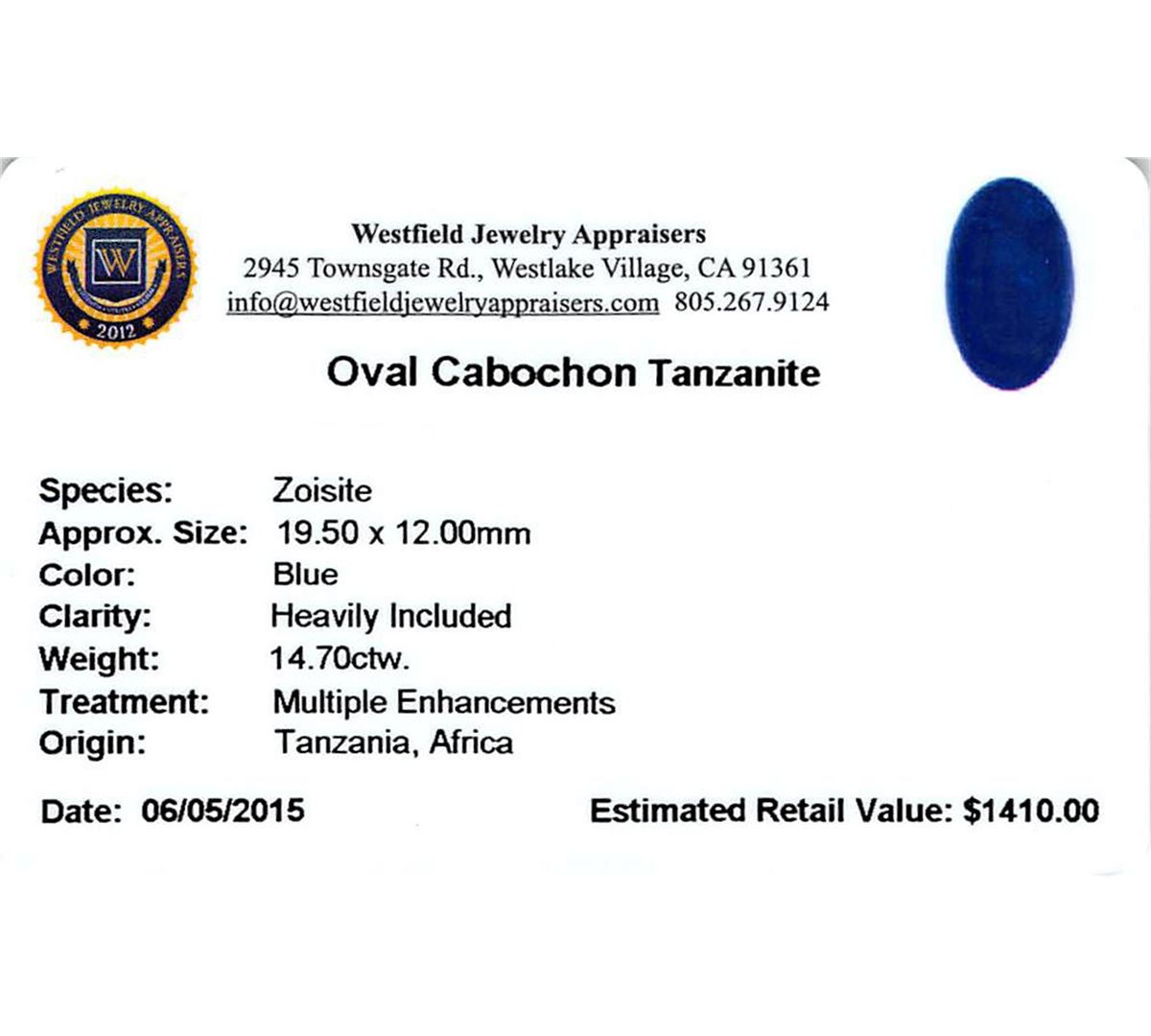 One oval cabochon cut natural tanzanite, measuring 19.50 x 12.00 x 6.50mm, exact weight 14.70ct., clarity is heavily included, type I, dark, very slightly grayish, blue color, (GIA B 7/3), cut is good. Transmitting light somewhat diffusely, transparent to translucent. Naturally occurring internal & external characteristics are present. Indications of heat treatment. Westfield Appraised at $1,410.00.