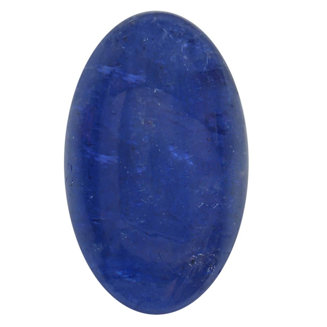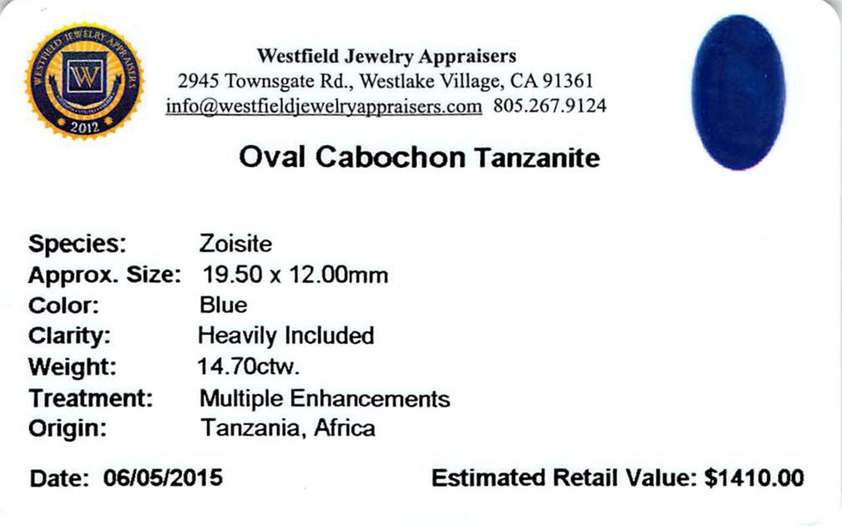One oval cabochon cut natural tanzanite, measuring 19.50 x 12.00 x 6.50mm, exact weight 14.70ct., clarity is heavily included, type I, dark, very slightly grayish, blue color, (GIA B 7/3), cut is good. Transmitting light somewhat diffusely, transparent to translucent. Naturally occurring internal & external characteristics are present. Indications of heat treatment. Westfield Appraised at $1,410.00.