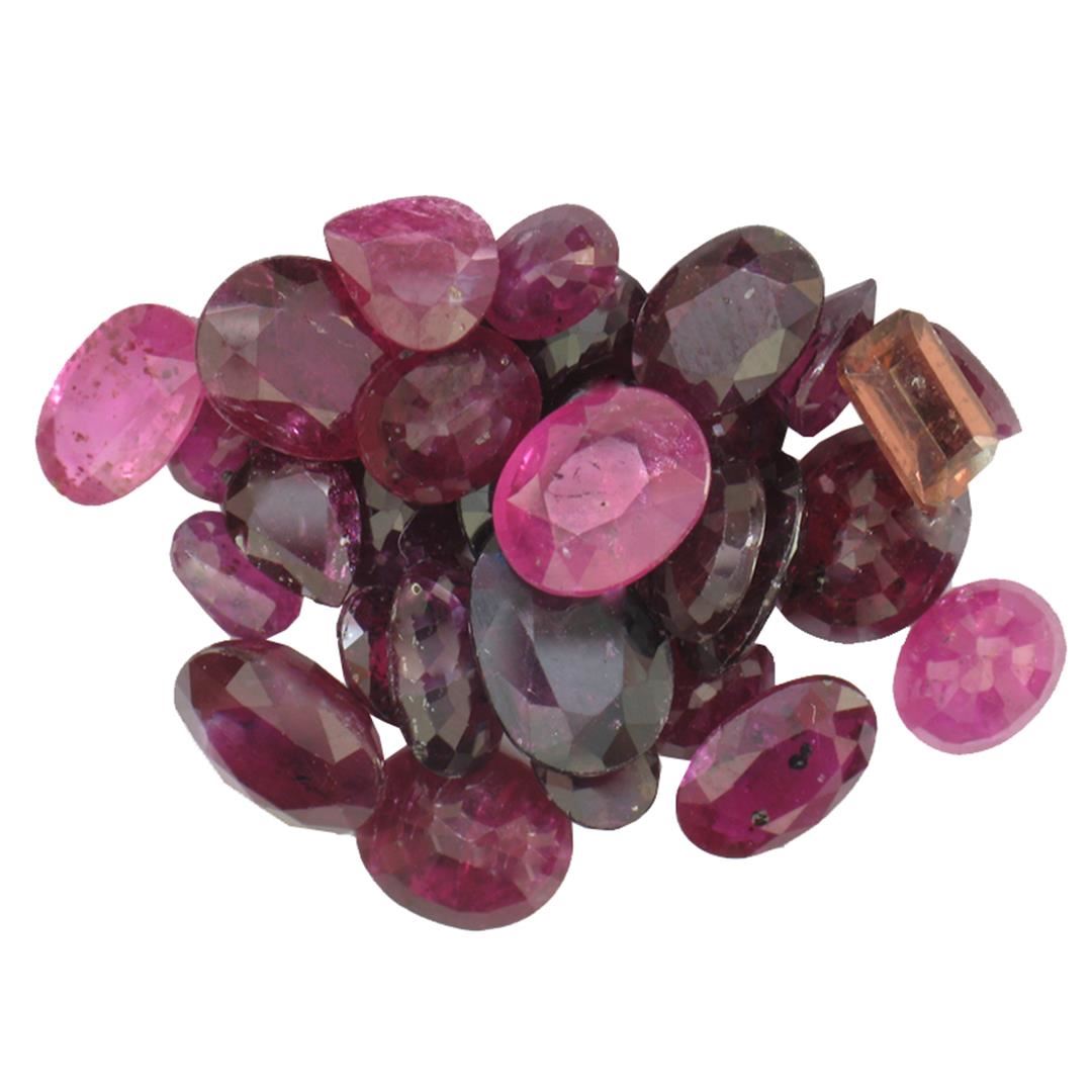 Thirty-one various shapes & sizes cut natural rubies exact total weight 14.71ct., clarity is heavily included, type II, dark, very slightly brownish, slightly purplish red color, (GIA slpR 7/3), cut is good. Transmitting light somewhat diffusely, transparent to translucent. Naturally occurring internal & external characteristics are present. Indications of laboratory high temperature heat treatment, with glass & flux additives. Ruby has a low tolerance to rhodium plating, repolishing the surface, & ultrasonic cleaning. Westfield Appraised at $1,465.00.