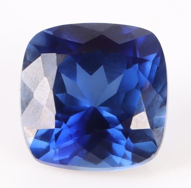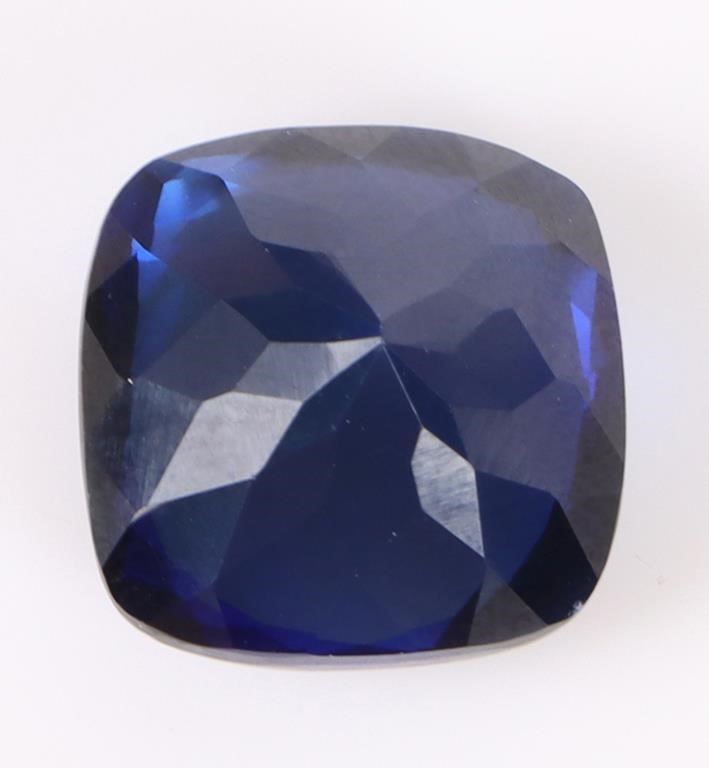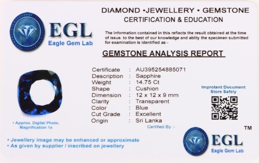14.75 cushion-cut blue sapphire loose gemstone with EGL certification. Gemstone has been electronically tested and identified, tester does not distinguish between lab grown and natural.