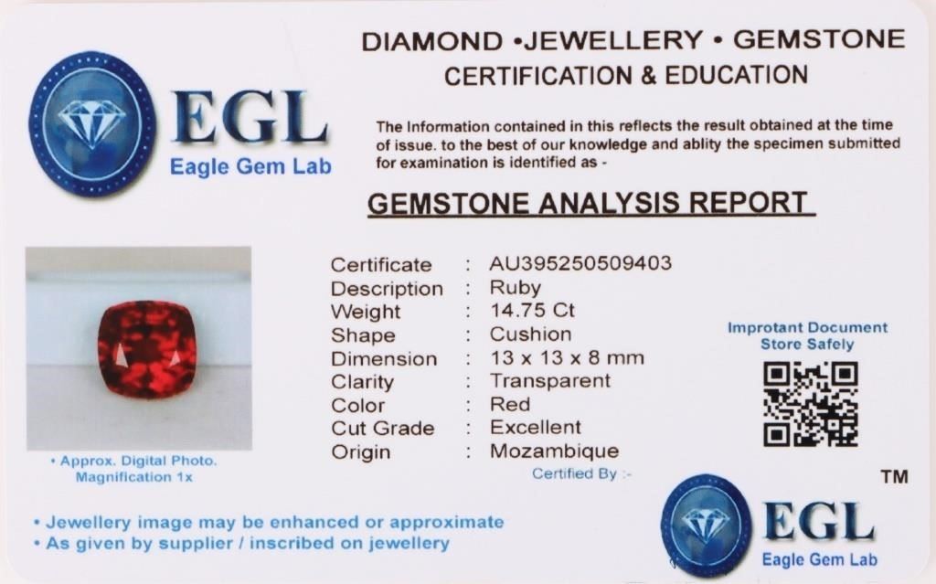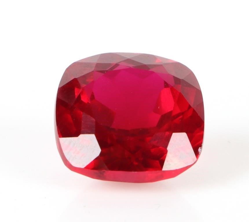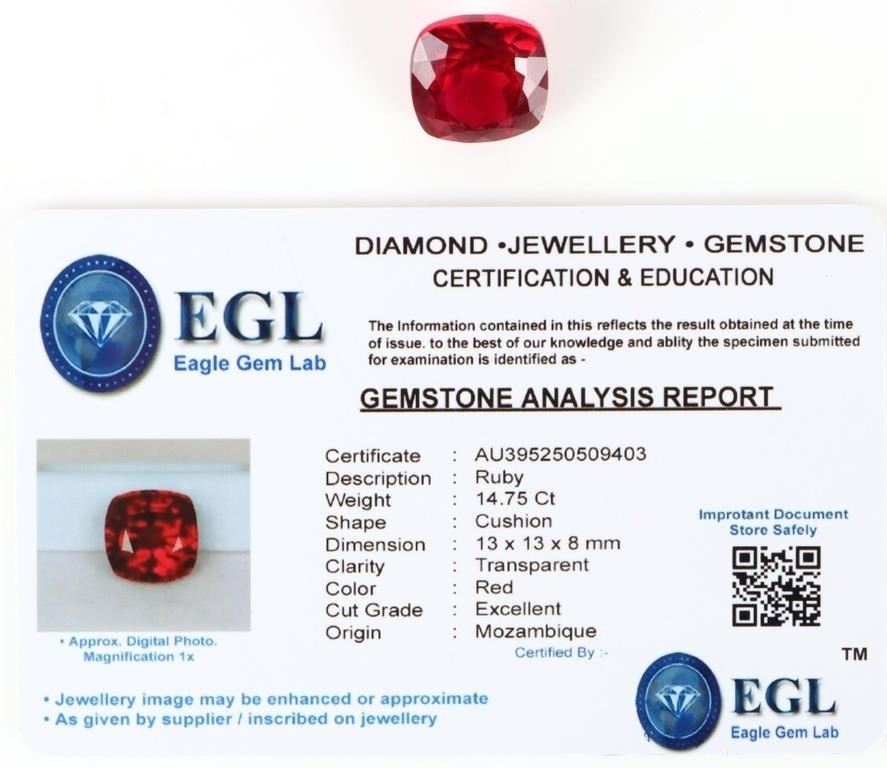 14.75ct cushion-cut red ruby loose gemstone with EGL certification. Gemstone has been electronically tested and identified, tester does not distinguish between lab-creations and natural gemstones.