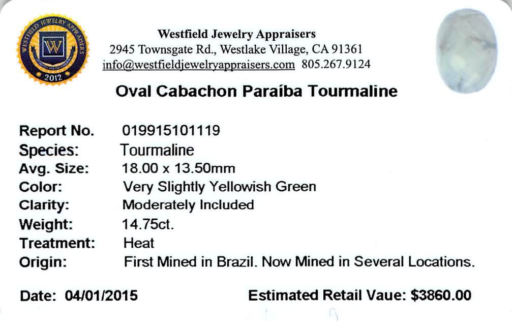 One oval cabochon cut natural Paraiba tourmaline exact weight 14.75ct., clarity is moderately included, cut is good. Westfield Appraised at $3,860.00.