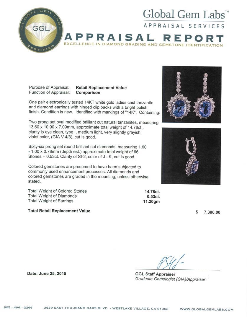 One pair electronically tested 14KT white gold ladies cast tanzanite and diamond earrings with hinged clip backs with a bright polish finish. Identified with markings of "14K". Condition is new. Containing: Two prong set oval modified brilliant cut natural tanzanites, measuring 13.60 x 10.90 x 7.09mm, approximate. Total Weight of 14.78ct., clarity is eye clean, type I, medium light, very slightly grayish, violet color, (GIA V 4/3), cut is good. Sixty-Six prong set round brilliant cut diamonds, measuring 1.60 - 1.00 x 0.78mm (depth est.) approximate. Total Weight of 66 Stones = 0.53ct. Clarity: SI-2. Color: J - K, Cut is Good. Colored gemstones are presumed to have been subjected to commonly used enhancement processes. All diamonds and colored gemstones are graded in the mounting, unless otherwise stated. Total Weight of Colored Stones 14.78ct. Total Weight of Diamonds 0.53ct. Total Weight of Earrings 11.20 grams. GGL Appraised at $7,380.00.