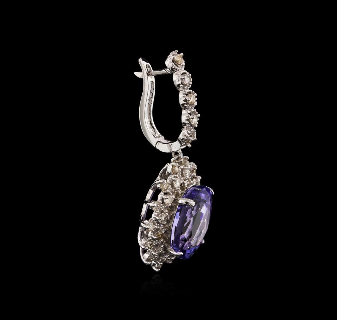 One pair electronically tested 14KT white gold ladies cast tanzanite and diamond earrings with hinged clip backs with a bright polish finish. Identified with markings of "14K". Condition is new. Containing: Two prong set oval modified brilliant cut natural tanzanites, measuring 13.60 x 10.90 x 7.09mm, approximate. Total Weight of 14.78ct., clarity is eye clean, type I, medium light, very slightly grayish, violet color, (GIA V 4/3), cut is good. Sixty-Six prong set round brilliant cut diamonds, measuring 1.60 - 1.00 x 0.78mm (depth est.) approximate. Total Weight of 66 Stones = 0.53ct. Clarity: SI-2. Color: J - K, Cut is Good. Colored gemstones are presumed to have been subjected to commonly used enhancement processes. All diamonds and colored gemstones are graded in the mounting, unless otherwise stated. Total Weight of Colored Stones 14.78ct. Total Weight of Diamonds 0.53ct. Total Weight of Earrings 11.20 grams. GGL Appraised at $7,380.00.