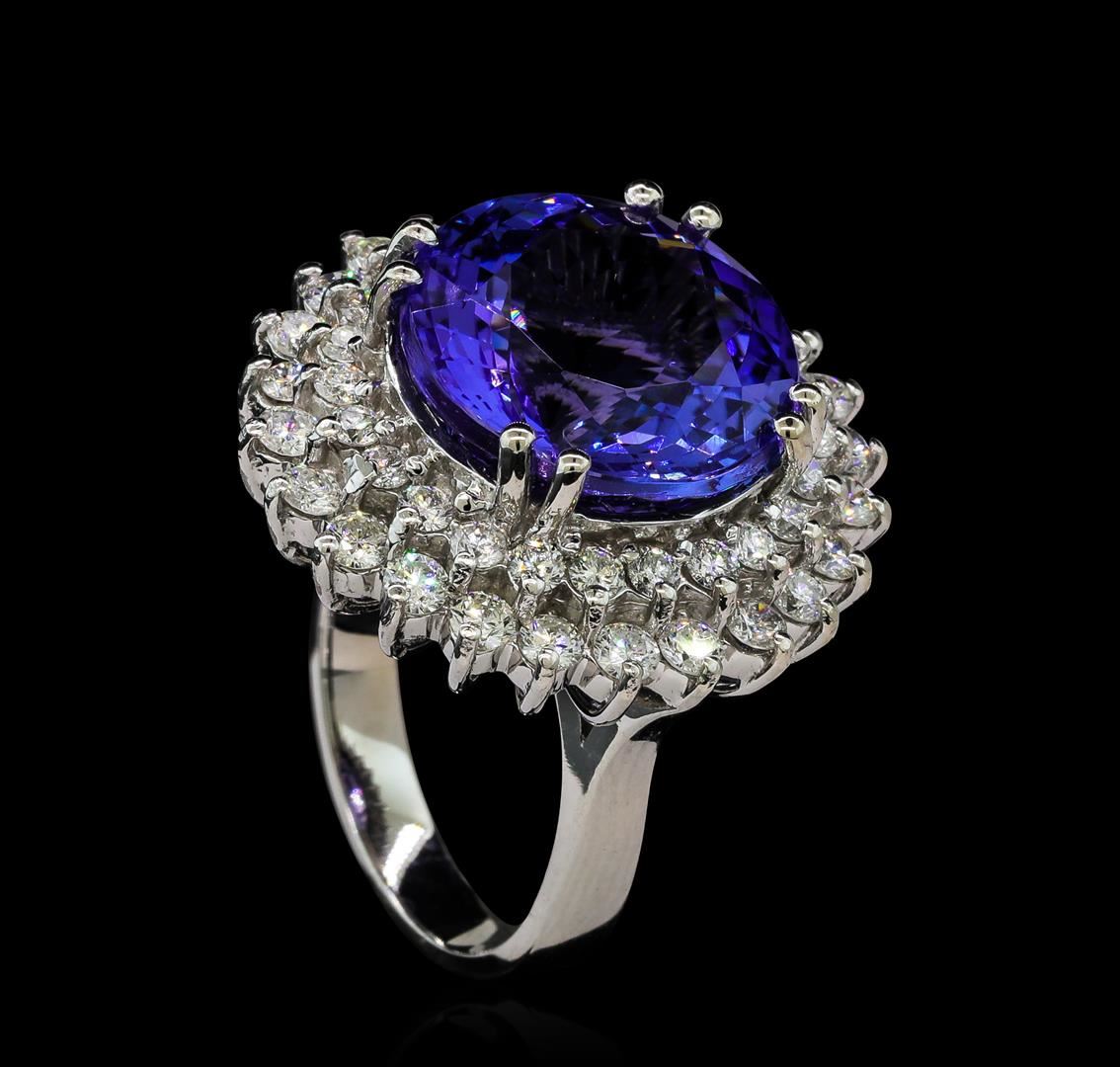 One electronically tested 14KT white gold ladies cast tanzanite and diamond ring with a bright polish finish. The featured tanzanite is set within a tiered diamond floret supported by a ribbed under gallery, completed by a three millimeter wide band. Identified with markings of 'K14'. Condition is new, good workmanship. Containing: One prong set round mixed cut natural tanzanite, measuring 14.90 - 14.80 x 9.65 mm, 3%. bulge factor, approximate weight of 14.78ct., clarity is eye clean, type I, medium dark, very slightly grayish, bluish violet color, (GIA bV 6/3), cut is good. Transmitting light with no distortion, transparent. Colored Stone Grading Report attached. Graded in the setting. Tanzanite is a very rare gemstone that is only found in the country of Tanzania. Originally discovered in 1967. Tiffany & Company, named the stone Tanzanite. It is found in the Usumburu Mountains that border the Umba Valley of northern Tanzania. Tanzanite occurs in gray, brown, violet, blue, reddish-purple, & green. The gem is interesting because of its exceptional pleochroism. Rotated in different directions a tanzanite will exhibit multiple changes of color. Tanzanite has a low tolerance to ultrasonic cleaning, and should not be cleaned using this method. Twenty-Four prong set round brilliant cut diamonds, measuring 2.50 - 2.50 x 1.50mm (depth est.) approximate total weight of 24 Stones = 1.42ct. The clarity grade reflects the entire range of clarity for this group. Graded in the setting. Clarity SI-1 to I-2. Color: F - H Twenty-Four prong set round brilliant cut diamonds, measuring 2.10 - 2.00 x 1.23mm (depth est.) approximate total weight of 24 Stones = 0.76ct. The clarity grade reflects the entire range of clarity for this group. Graded in the setting. Clarity SI-1 to I-2. Color: F - H. Total Weight of Colored Stones 14.78ct.. Total Weight of Diamonds 2.18ct.. Total Weight of Ring 13.84gm. AIG Appraised at $37,820.00.