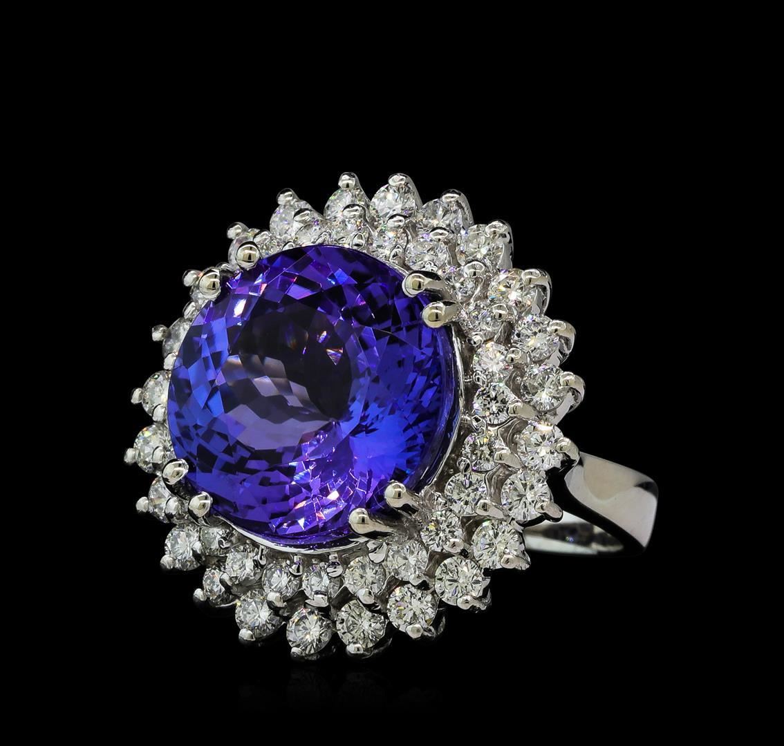 One electronically tested 14KT white gold ladies cast tanzanite and diamond ring with a bright polish finish. The featured tanzanite is set within a tiered diamond floret supported by a ribbed under gallery, completed by a three millimeter wide band. Identified with markings of 'K14'. Condition is new, good workmanship. Containing: One prong set round mixed cut natural tanzanite, measuring 14.90 - 14.80 x 9.65 mm, 3%. bulge factor, approximate weight of 14.78ct., clarity is eye clean, type I, medium dark, very slightly grayish, bluish violet color, (GIA bV 6/3), cut is good. Transmitting light with no distortion, transparent. Colored Stone Grading Report attached. Graded in the setting. Tanzanite is a very rare gemstone that is only found in the country of Tanzania. Originally discovered in 1967. Tiffany & Company, named the stone Tanzanite. It is found in the Usumburu Mountains that border the Umba Valley of northern Tanzania. Tanzanite occurs in gray, brown, violet, blue, reddish-purple, & green. The gem is interesting because of its exceptional pleochroism. Rotated in different directions a tanzanite will exhibit multiple changes of color. Tanzanite has a low tolerance to ultrasonic cleaning, and should not be cleaned using this method. Twenty-Four prong set round brilliant cut diamonds, measuring 2.50 - 2.50 x 1.50mm (depth est.) approximate total weight of 24 Stones = 1.42ct. The clarity grade reflects the entire range of clarity for this group. Graded in the setting. Clarity SI-1 to I-2. Color: F - H Twenty-Four prong set round brilliant cut diamonds, measuring 2.10 - 2.00 x 1.23mm (depth est.) approximate total weight of 24 Stones = 0.76ct. The clarity grade reflects the entire range of clarity for this group. Graded in the setting. Clarity SI-1 to I-2. Color: F - H. Total Weight of Colored Stones 14.78ct.. Total Weight of Diamonds 2.18ct.. Total Weight of Ring 13.84gm. AIG Appraised.