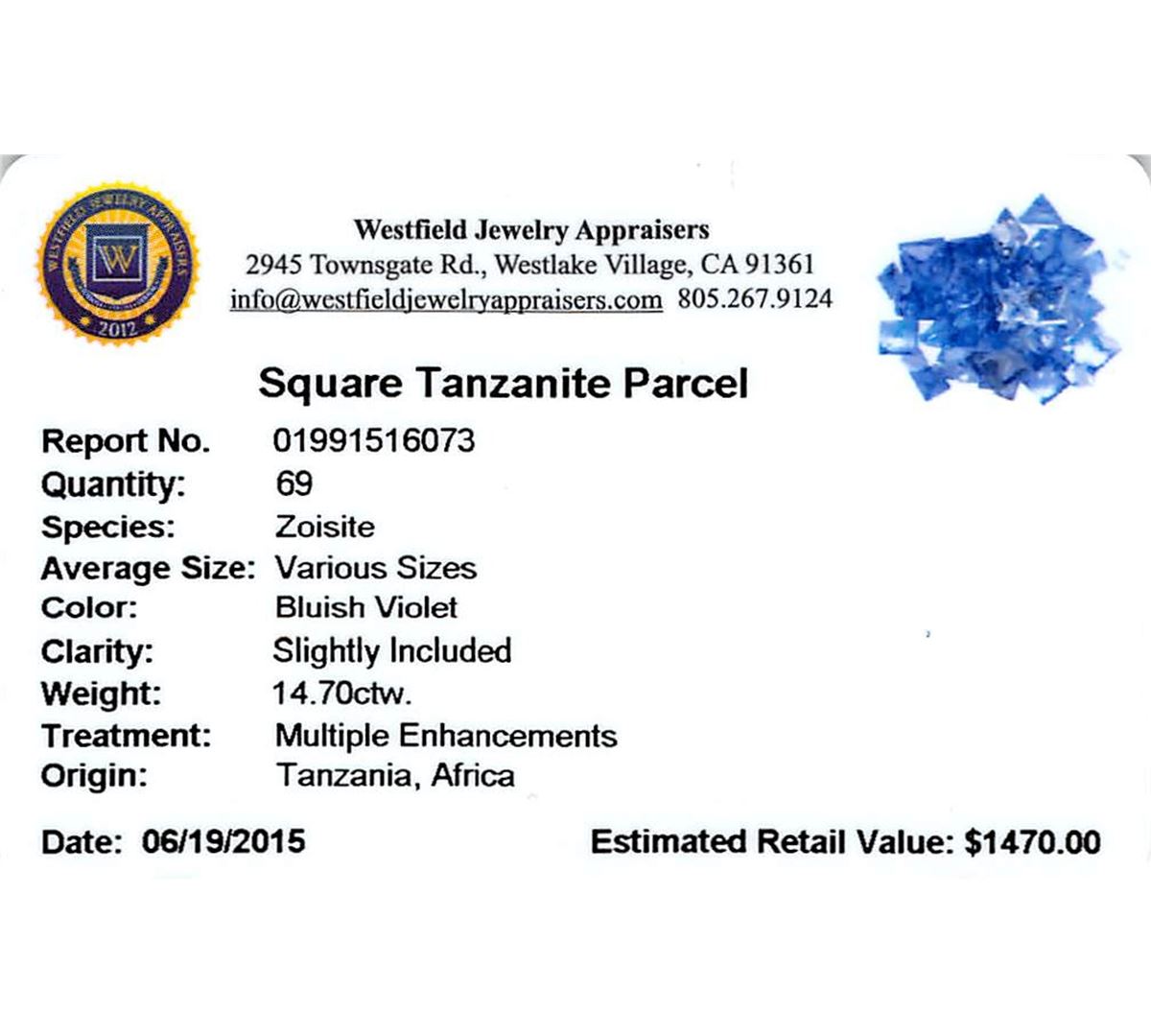 Sixty-nine square mixed cut natural tanzanites exact total weight 14.70ct., clarity is slightly included, type I, medium dark, very slightly grayish, bluish violet color, (GIA bV 6/3), cut is good. Transmitting light with a minimum of distortion, transparent. Naturally occurring internal & external characteristics are present. Color grade is an average for the group. Tanzanite is a very rare gemstone that is only found in the country of Tanzania. Originally discovered in 1967. Tiffany & Company, named the stone Tanzanite. It is found in the Usumburu Mountains that border the Umba Valley of northern Tanzania. Tanzanite occurs in gray, brown, violet, blue, reddish-purple, & green. The gem is interesting because of its exceptional pleochroism. Rotated in different directions a tanzanite will exhibit multiple changes of color. Tanzanite has a low tolerance to ultrasonic cleaning, and should not be cleaned using this method. Westfield Appraised at $1,415.00.