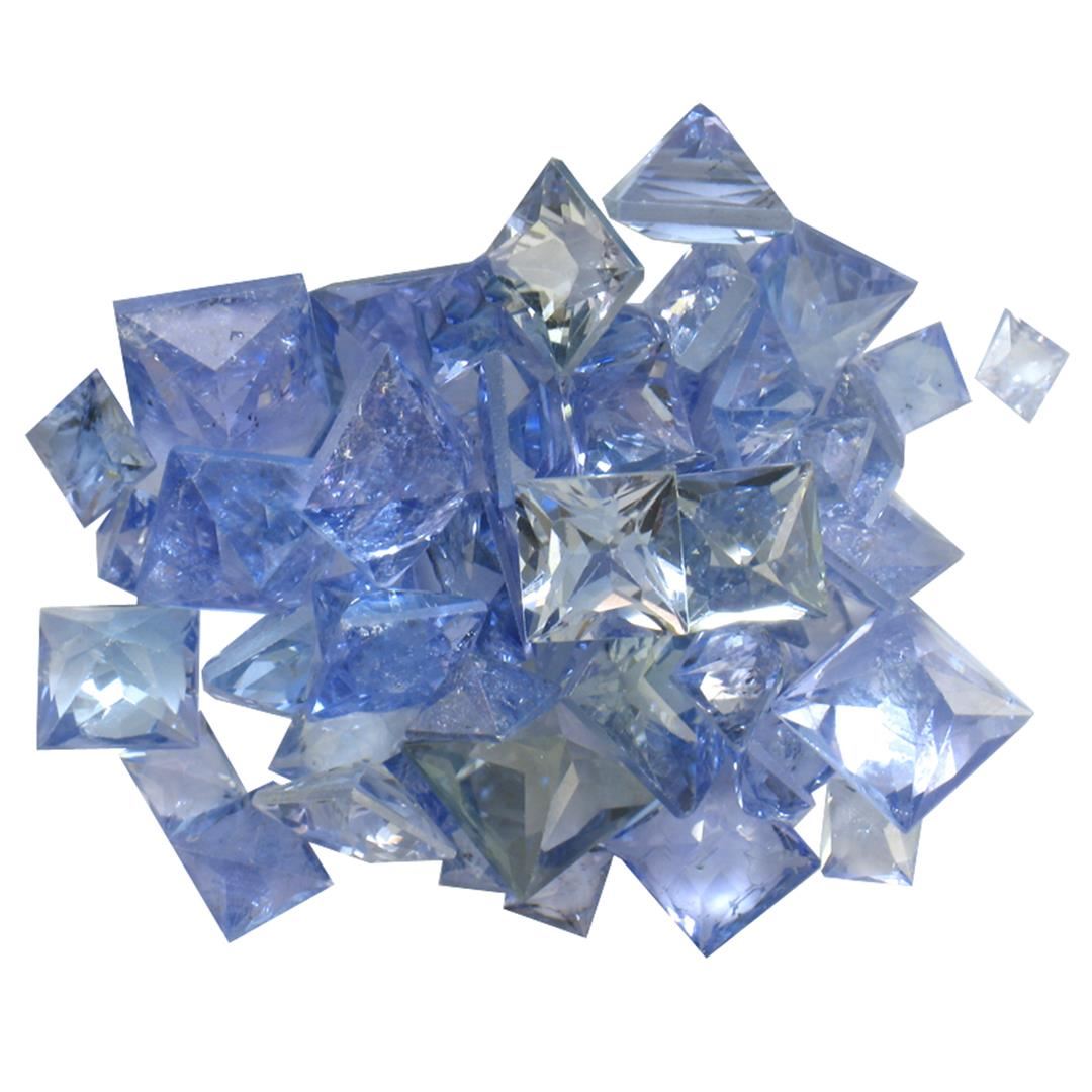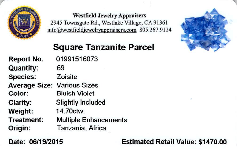 Sixty-nine square mixed cut natural tanzanites exact total weight 14.70ct., clarity is slightly included, type I, medium dark, very slightly grayish, bluish violet color, (GIA bV 6/3), cut is good. Transmitting light with a minimum of distortion, transparent. Naturally occurring internal & external characteristics are present. Color grade is an average for the group. Tanzanite is a very rare gemstone that is only found in the country of Tanzania. Originally discovered in 1967. Tiffany & Company, named the stone Tanzanite. It is found in the Usumburu Mountains that border the Umba Valley of northern Tanzania. Tanzanite occurs in gray, brown, violet, blue, reddish-purple, & green. The gem is interesting because of its exceptional pleochroism. Rotated in different directions a tanzanite will exhibit multiple changes of color. Tanzanite has a low tolerance to ultrasonic cleaning, and should not be cleaned using this method. Westfield Appraised at $1,415.00.
