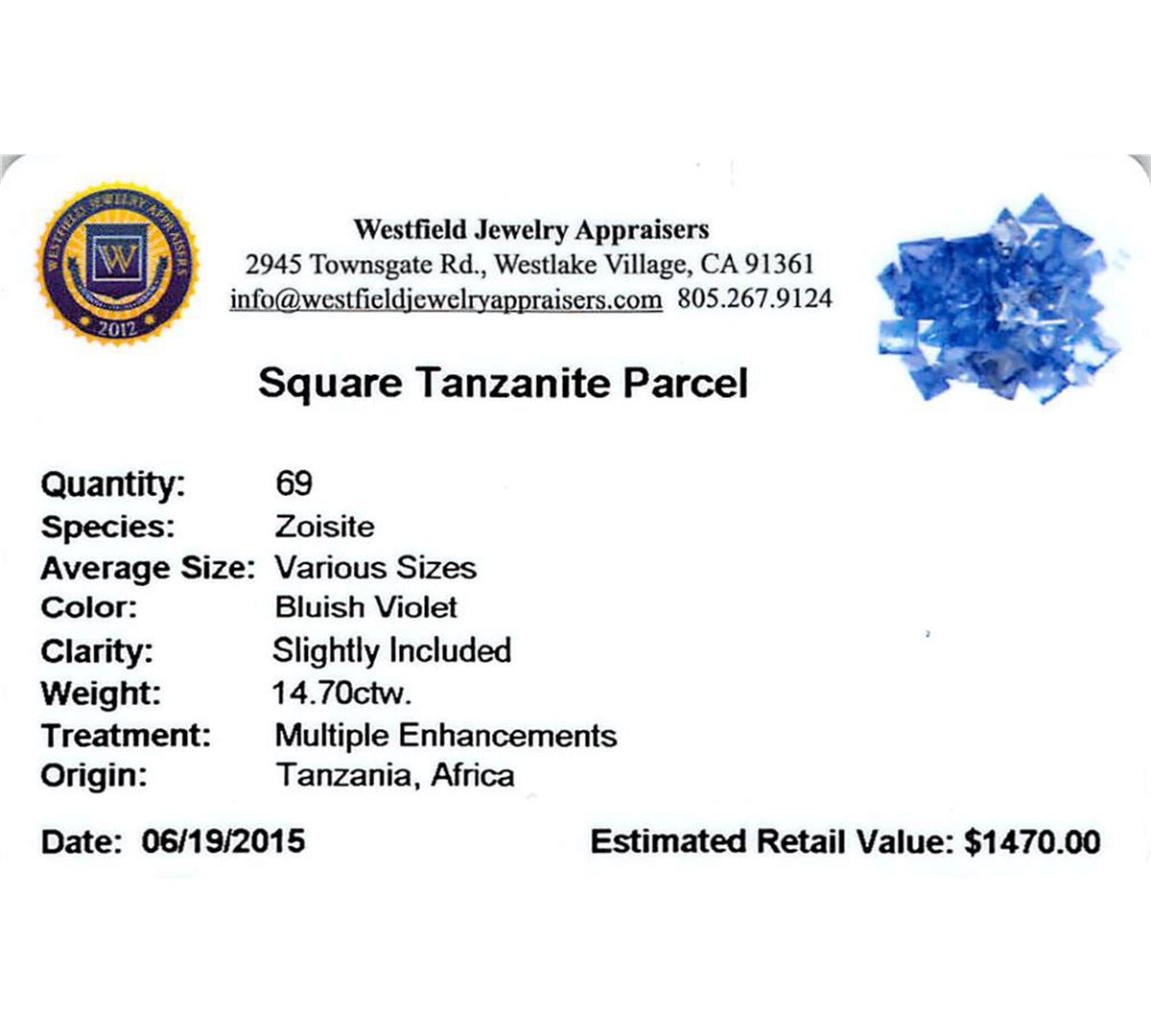 Sixty-nine square mixed cut natural tanzanites exact total weight 14.70ct., clarity is slightly included, type I, medium dark, very slightly grayish, bluish violet color, (GIA bV 6/3), cut is good. Transmitting light with a minimum of distortion, transparent. Naturally occurring internal & external characteristics are present. Color grade is an average for the group. Tanzanite is a very rare gemstone that is only found in the country of Tanzania. Originally discovered in 1967. Tiffany & Company, named the stone Tanzanite. It is found in the Usumburu Mountains that border the Umba Valley of northern Tanzania. Tanzanite occurs in gray, brown, violet, blue, reddish-purple, & green. The gem is interesting because of its exceptional pleochroism. Rotated in different directions a tanzanite will exhibit multiple changes of color. Tanzanite has a low tolerance to ultrasonic cleaning, and should not be cleaned using this method. Westfield Appraised at $1,415.00.