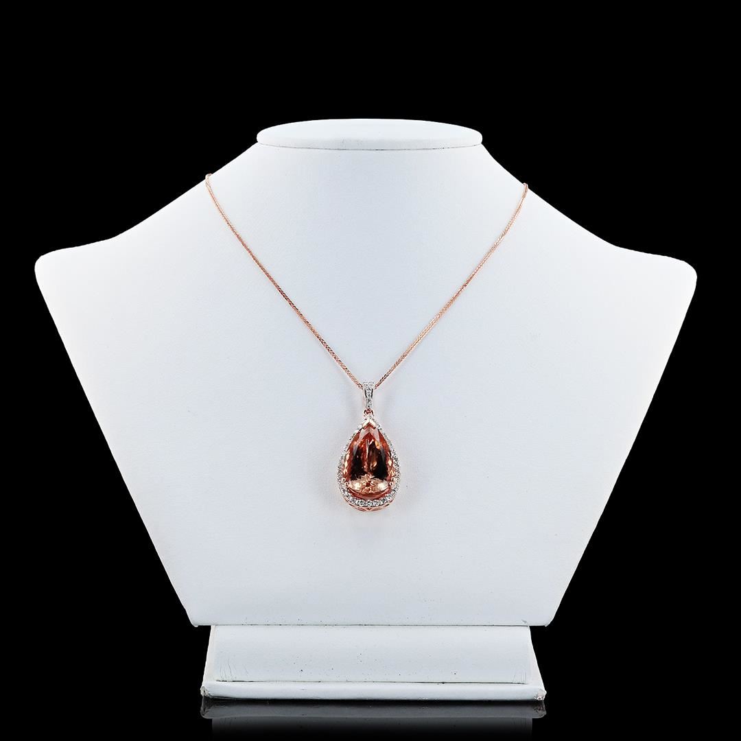 One polished, stamped, and tested, 14K rose gold pendant marked Oscar Friedman. The pendant is mounted with: 1 genuine morganite center stone weighing approximately 14.80 carat, and 44 genuine round diamonds weighing approximately 0.98 carats. The pendant