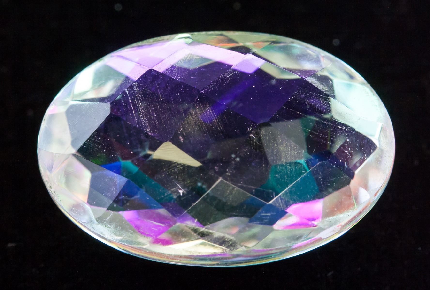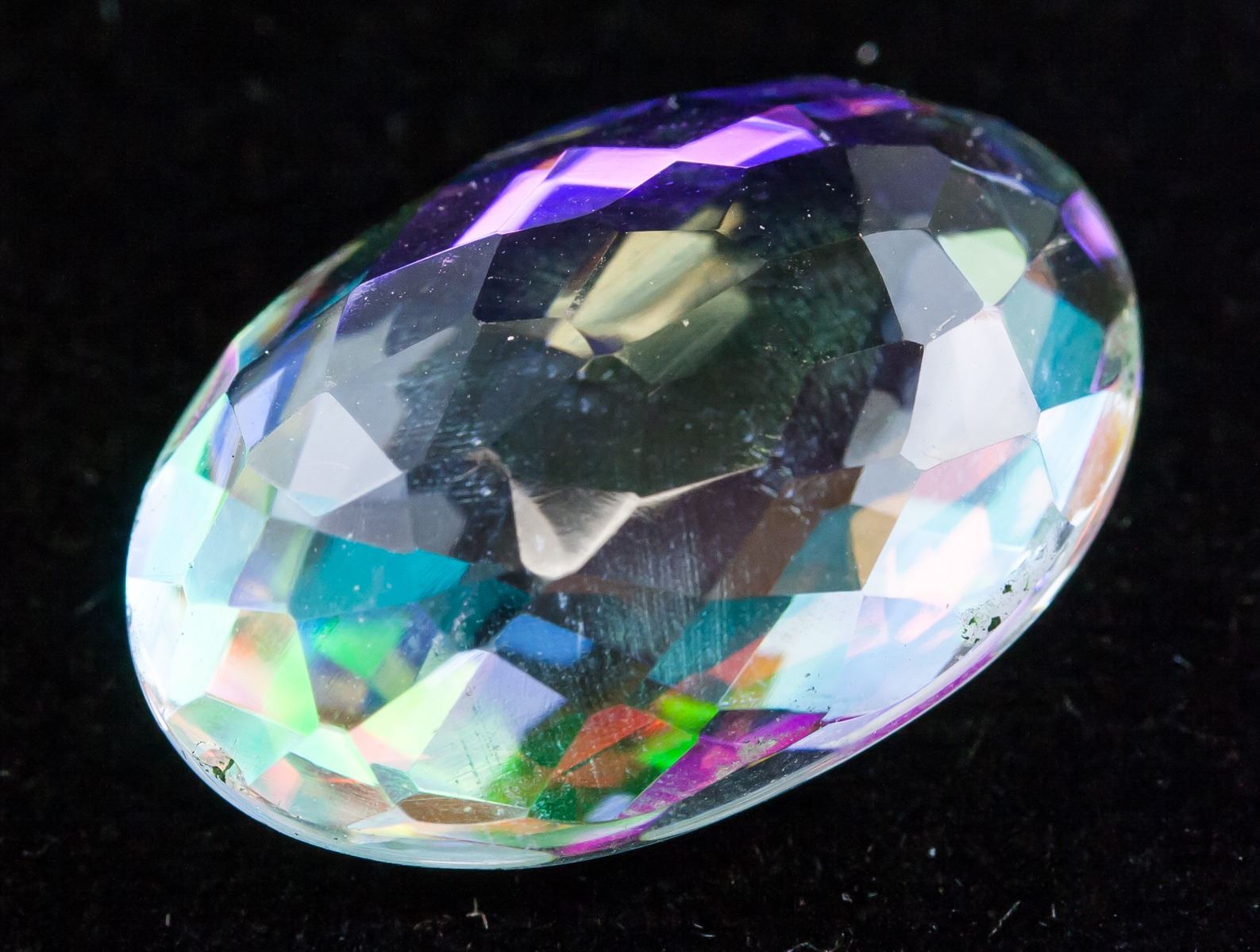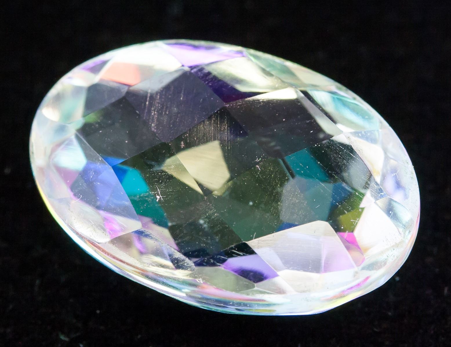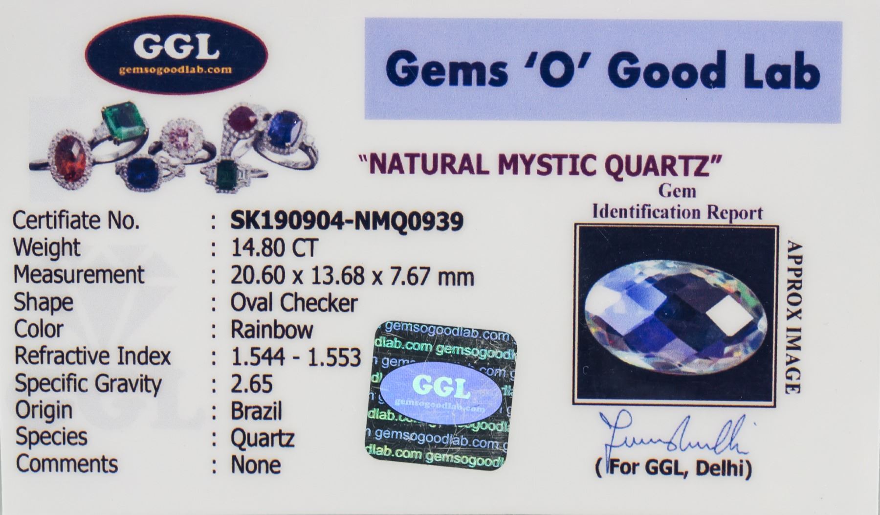 One (1) 14.80 ct oval checker cut rainbow color mystic quartz gemstone. 20.60 x 13.68 x 7.67 mm. Accompanied with GGL certificate.