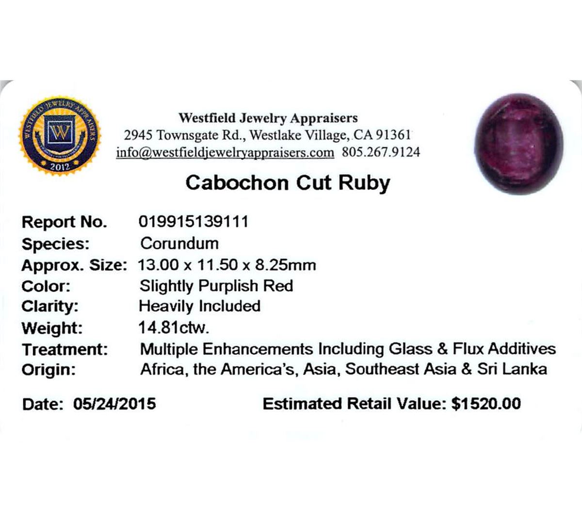 One oval cabochon cut natural ruby, measuring 13.00 x 11.50 x 8.25mm, exact weight 14.81ct., clarity is heavily included, type II, dark, very slightly brownish, slightly purplish red color, (GIA slpR 7/3), cut is good. Transmitting light diffusely, opaque. Naturally occurring internal & external characteristics are present. Indications of laboratory high temperature heat treatment, with glass & flux additives. Ruby has a low tolerance to rhodium plating, repolishing the surface, & ultrasonic cleaning. Westfield Appraised at $1,520.00.