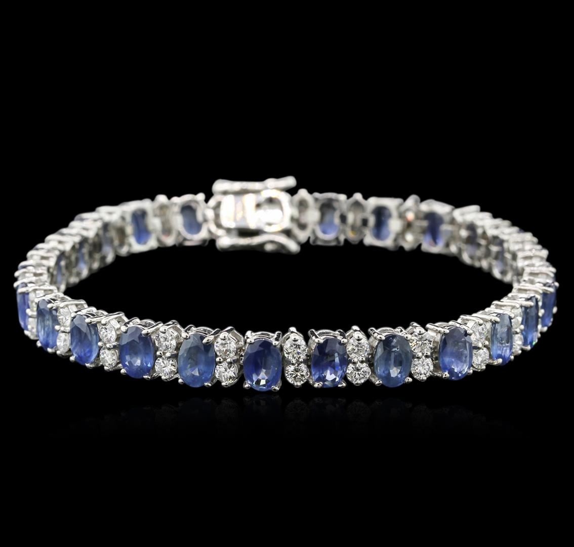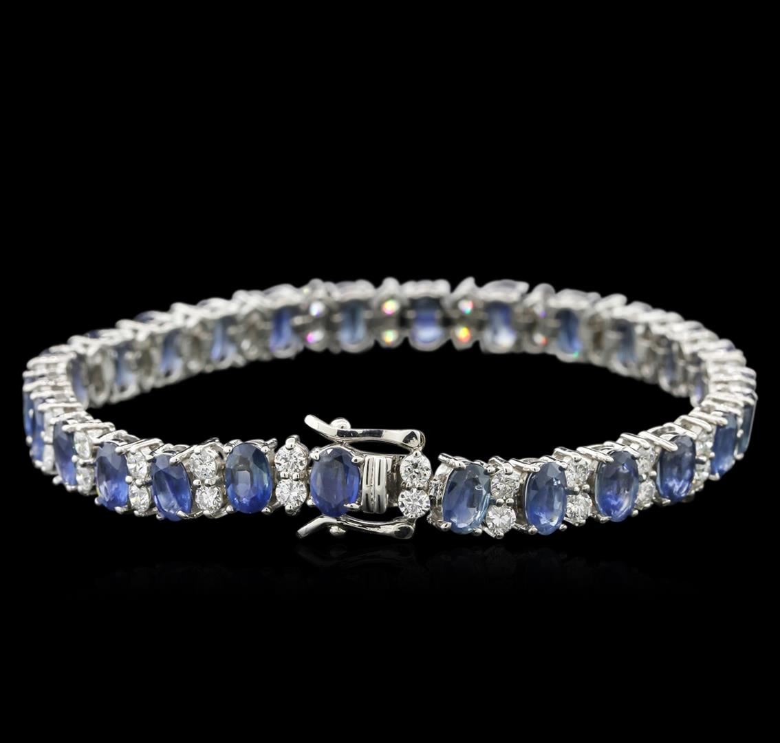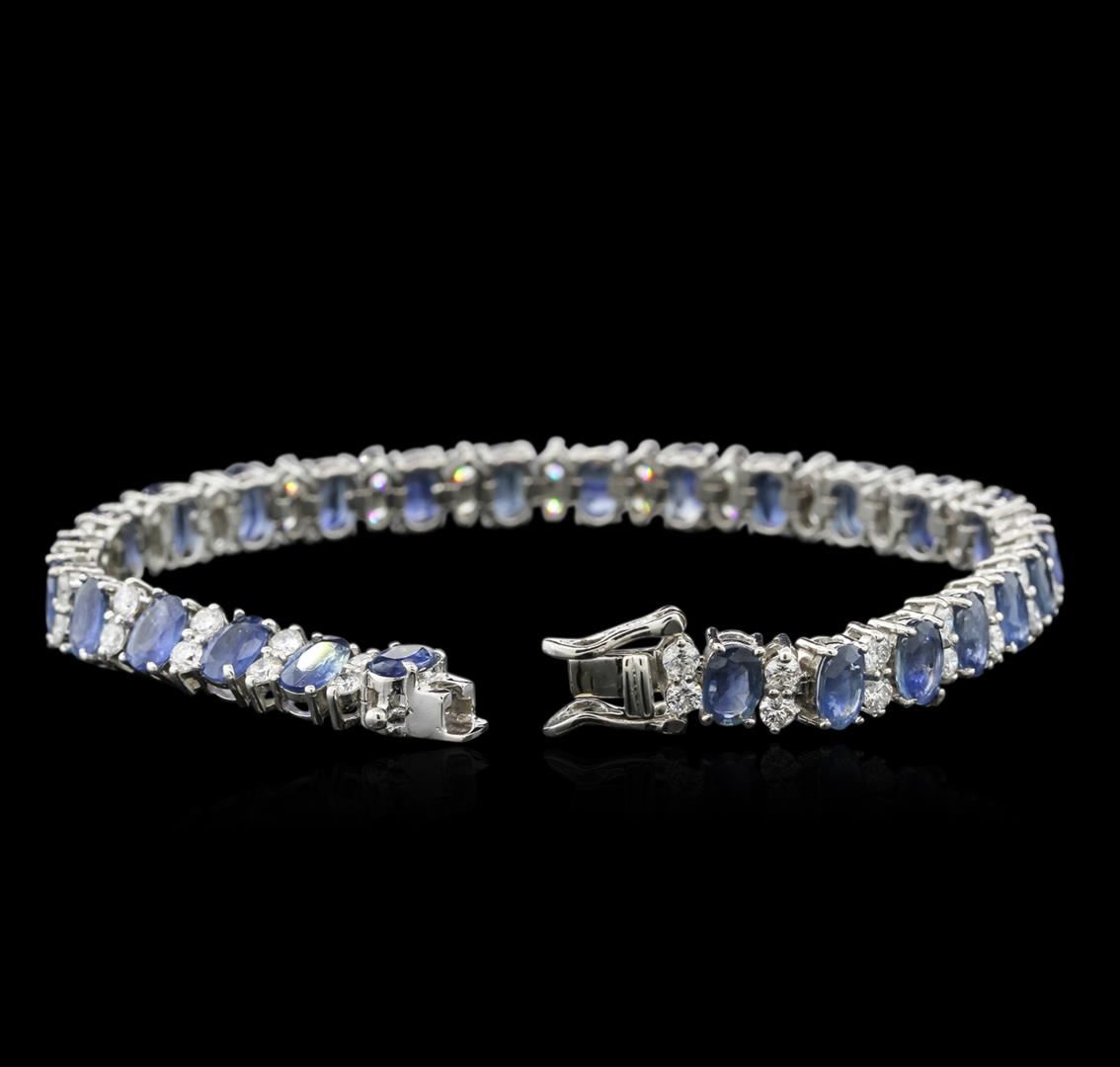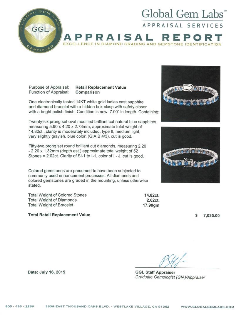 One electronically tested 14KT white gold ladies cast sapphire and diamond bracelet with a hidden box clasp with safety closer with a bright polish finish. 7.00." in length Condition is new. Containing: Twenty-six prong set oval modified brilliant cut natural blue sapphires, measuring 5.90 x 4.20 x 2.73mm, approximate total weight of 14.82ct., clarity is moderately included, type II, medium light, very slightly grayish, blue color, (GIA B 4/3), cut is good. Fifty-Two prong set round brilliant cut diamonds, measuring 2.20 - 2.20 x 1.32mm (depth est.) approximate total weight of 52 Stones = 2.02ct. Clarity: SI-1 to I-1. Color: I - J, Cut is Good. Colored gemstones are presumed to have been subjected to commonly used enhancement processes. All diamonds and colored gemstones are graded in the mounting, unless otherwise stated. Total Weight of Colored Stones 14.82ct. Total Weight of Diamonds 2.02ct. Total Weight of Bracelet 17.90 grams. GGL Appraised at $7,035.00.