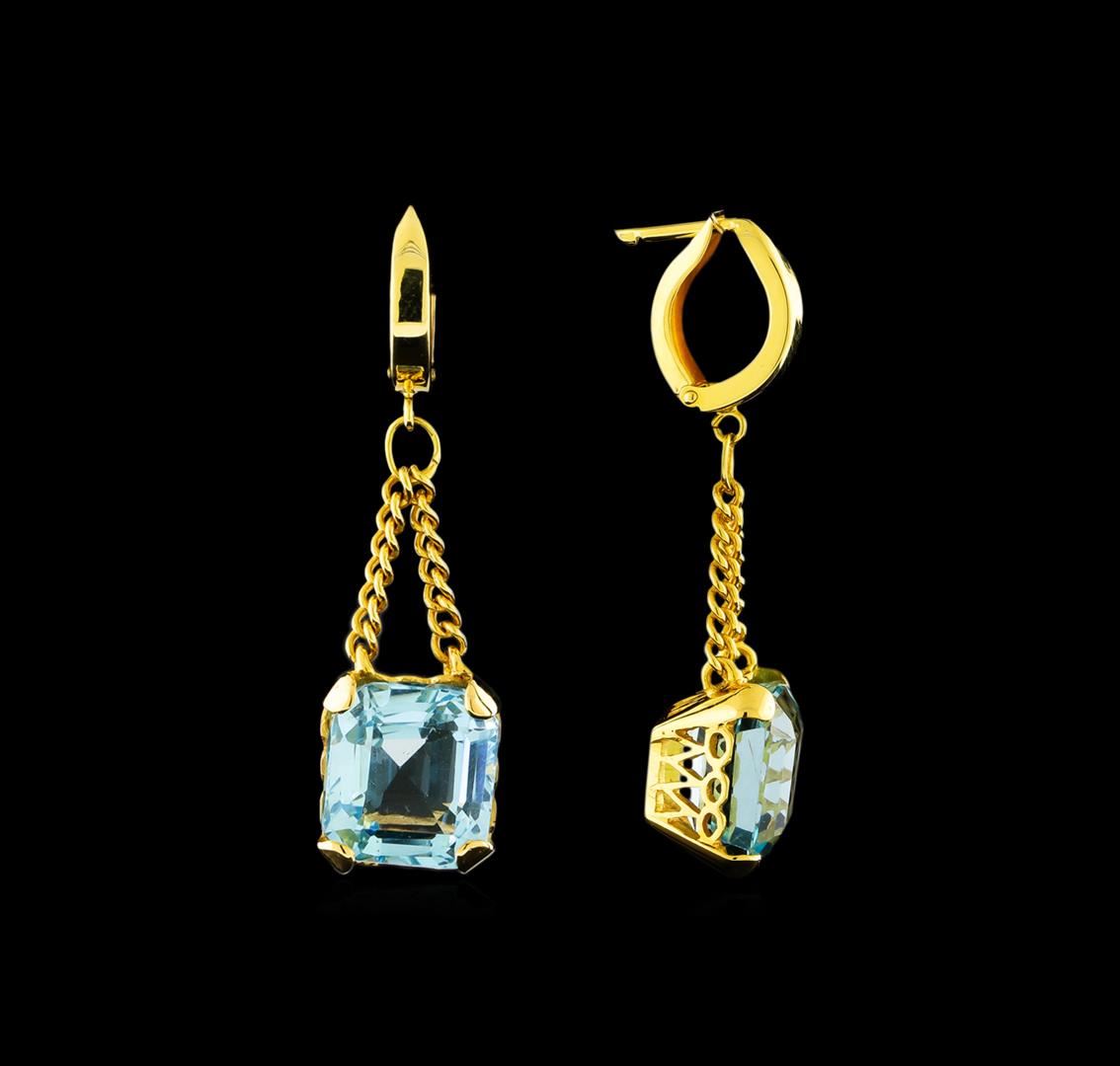 One pair electronically tested 14KT yellow gold ladies cast & assembled aquamarine solitaire earrings with hinged, snap locking posts. Each earring features an aquamarine solitaire dangle supported by two yellow gold link ribbons, completed by a yellow gold huggie. Bright polish finish. Identified with markings of "14K". Condition is good. Containing: One prong set emerald step cut natural aquamarine, measuring 11.58 x 10.75 x 7.70mm, 6%. bulge factor, approximate total weight of 7.46ct., clarity is eye clean, type I, medium, very slightly grayish, very slightly greenish blue color, (GIA vslgB 5/3), cut is good. Transmitting light with no distortion, transparent. Refractive index testing results of 1.57 to 1.58. This is a conclusive result for beryl (aquamarine). Graded in the setting. One prong set emerald step cut natural aquamarine, measuring 11.75 x 10.75 x 7.50mm, 6%. bulge factor, approximate weight of 7.37ct., clarity is eye clean, type I, medium, very slightly grayish, very slightly greenish blue color, (GIA vslgB 5/3), cut is good. Transmitting light with no distortion, transparent. Refractive index testing results of 1.57 to 1.58. This is a conclusive result for beryl (aquamarine). Graded in the setting. Total Weight of Colored Stones 14.83ct. Total Weight of Earrings 8.21gm. AIG Appraised at $8,490.00.