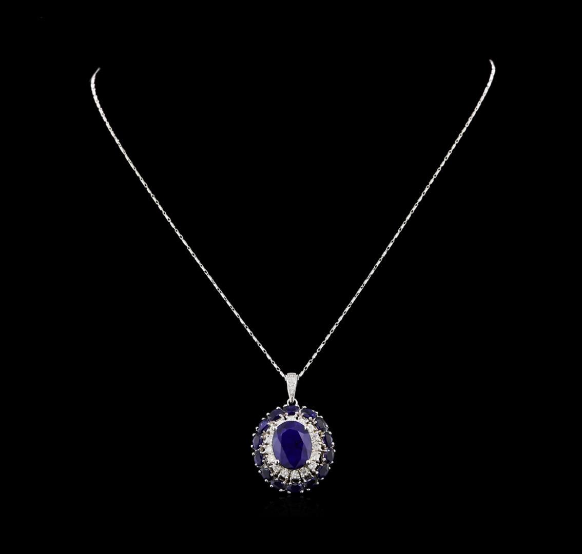 14K Gold Sapphire & Diamond Pendant. One polished, stamped, and tested 14K white gold pendant mounted with: 15 faceted sapphires weighing 14.83 carats, and 25 faceted round diamonds weighing 1.11 carats. The pendant hangs on a 14 K white gold link chain measuring 18 inches in length. This item weighs 14.9 grams, condition is new, excellent workmanship. Species: Natural Corundum. Variety: Sapphire. Shape: oval. Cutting style: Brilliant cut crown step cut pavilion. Quantity: 15 sapphires. Measurements: 5x3-15x12 mm. Total weight: 14.83 carats. Color: blue. Cut grade: very good. Treatment: Heat/fracture filled. Refractive index: 1.762-1.770 DR. Birefringence: 0.008-0.010. Hardness: 9. Adjacent Gemstones on Pendant: Identity: Natural diamond. Shape: Round. Cutting style: brilliant cut. Quantity: 25 diamonds. Measurements: 1.0-2.5 mm. Total weight: 1.11 carats. Clarity grade: SI1-SI3. color grade: I-J. Refractive index: 2.418. Hardness: 10. AIGL Appraised at $8,658.00.
