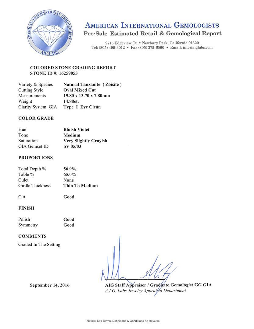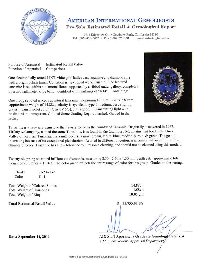 One electronically tested 14KT white gold ladies cast tanzanite and diamond ring with a bright polish finish. The featured tanzanite is set within a diamond floret supported by a ribbed under gallery, completed by a two millimeter wide band. Identified with markings of 'K14'. Condition is new, good workmanship. Containing: One prong set oval mixed cut natural tanzanite, measuring 19.80 x 13.70 x 7.80mm, approximate weight of 14.88ct., clarity is eye clean, type I, medium, very slightly grayish, bluish violet color, (GIA bV 5/3), cut is good. Transmitting light with no distortion, transparent. Colored Stone Grading Report attached. Graded in the setting. Tanzanite is a very rare gemstone that is only found in the country of Tanzania. Originally discovered in 1967. Tiffany & Company, named the stone Tanzanite. It is found in the Usumburu Mountains that border the Umba Valley of northern Tanzania. Tanzanite occurs in gray, brown, violet, blue, reddish-purple, & green. The gem is interesting because of its exceptional pleochroism. Rotated in different directions a tanzanite will exhibit multiple changes of color. Tanzanite has a low tolerance to ultrasonic cleaning, and should not be cleaned using this method. Twenty-Six prong set round brilliant cut diamonds, measuring 2.50 - 2.50 x 1.50mm (depth est.) approximate total weight of 26 Stones = 1.58ct. The color grade reflects the entire range of color for this group. Graded in the setting. Clarity SI-2 to I-2. Color: F - I. Total Weight of Colored Stones 14.88ct.. Total Weight of Diamonds 1.58ct.. Total Weight of Ring 10.05gm. AIG Appraised at $35,755.00.