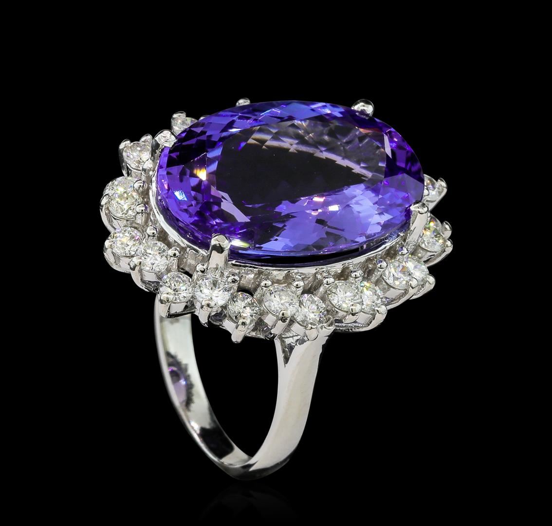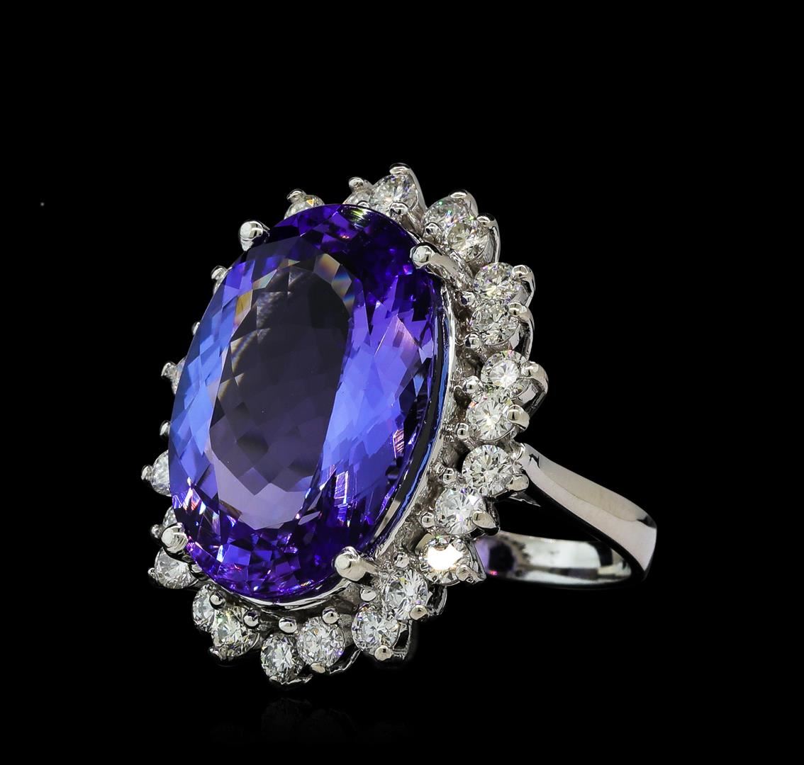 One electronically tested 14KT white gold ladies cast tanzanite and diamond ring with a bright polish finish. The featured tanzanite is set within a diamond floret supported by a ribbed under gallery, completed by a two millimeter wide band. Identified with markings of 'K14'. Condition is new, good workmanship. Containing: One prong set oval mixed cut natural tanzanite, measuring 19.80 x 13.70 x 7.80mm, approximate weight of 14.88ct., clarity is eye clean, type I, medium, very slightly grayish, bluish violet color, (GIA bV 5/3), cut is good. Transmitting light with no distortion, transparent. Colored Stone Grading Report attached. Graded in the setting. Tanzanite is a very rare gemstone that is only found in the country of Tanzania. Originally discovered in 1967. Tiffany & Company, named the stone Tanzanite. It is found in the Usumburu Mountains that border the Umba Valley of northern Tanzania. Tanzanite occurs in gray, brown, violet, blue, reddish-purple, & green. The gem is interesting because of its exceptional pleochroism. Rotated in different directions a tanzanite will exhibit multiple changes of color. Tanzanite has a low tolerance to ultrasonic cleaning, and should not be cleaned using this method. Twenty-Six prong set round brilliant cut diamonds, measuring 2.50 - 2.50 x 1.50mm (depth est.) approximate total weight of 26 Stones = 1.58ct. The color grade reflects the entire range of color for this group. Graded in the setting. Clarity SI-2 to I-2. Color: F - I. Total Weight of Colored Stones 14.88ct.. Total Weight of Diamonds 1.58ct.. Total Weight of Ring 10.05gm. AIG Appraised at $35,755.00.