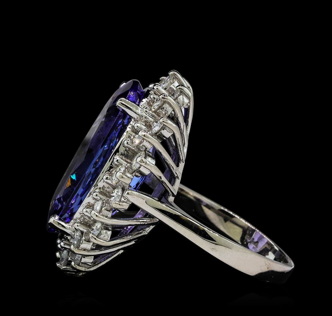 One electronically tested 14KT white gold ladies cast tanzanite and diamond ring with a bright polish finish. The featured tanzanite is set within a diamond floret supported by a ribbed under gallery, completed by a two millimeter wide band. Identified with markings of 'K14'. Condition is new, good workmanship. Containing: One prong set oval mixed cut natural tanzanite, measuring 19.80 x 13.70 x 7.80mm, approximate weight of 14.88ct., clarity is eye clean, type I, medium, very slightly grayish, bluish violet color, (GIA bV 5/3), cut is good. Transmitting light with no distortion, transparent. Colored Stone Grading Report attached. Graded in the setting. Tanzanite is a very rare gemstone that is only found in the country of Tanzania. Originally discovered in 1967. Tiffany & Company, named the stone Tanzanite. It is found in the Usumburu Mountains that border the Umba Valley of northern Tanzania. Tanzanite occurs in gray, brown, violet, blue, reddish-purple, & green. The gem is interesting because of its exceptional pleochroism. Rotated in different directions a tanzanite will exhibit multiple changes of color. Tanzanite has a low tolerance to ultrasonic cleaning, and should not be cleaned using this method. Twenty-Six prong set round brilliant cut diamonds, measuring 2.50 - 2.50 x 1.50mm (depth est.) approximate total weight of 26 Stones = 1.58ct. The color grade reflects the entire range of color for this group. Graded in the setting. Clarity SI-2 to I-2. Color: F - I. Total Weight of Colored Stones 14.88ct.. Total Weight of Diamonds 1.58ct.. Total Weight of Ring 10.05gm. AIG Appraised at $35,755.00.