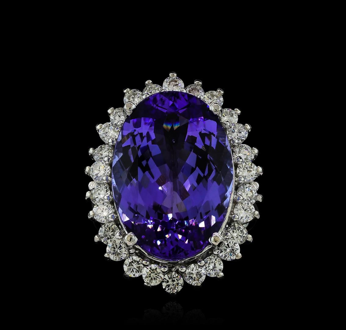 One electronically tested 14KT white gold ladies cast tanzanite and diamond ring with a bright polish finish. The featured tanzanite is set within a diamond floret supported by a ribbed under gallery, completed by a two millimeter wide band. Identified with markings of 'K14'. Condition is new, good workmanship. Containing: One prong set oval mixed cut natural tanzanite, measuring 19.80 x 13.70 x 7.80mm, approximate weight of 14.88ct., clarity is eye clean, type I, medium, very slightly grayish, bluish violet color, (GIA bV 5/3), cut is good. Transmitting light with no distortion, transparent. Colored Stone Grading Report attached. Graded in the setting. Tanzanite is a very rare gemstone that is only found in the country of Tanzania. Originally discovered in 1967. Tiffany & Company, named the stone Tanzanite. It is found in the Usumburu Mountains that border the Umba Valley of northern Tanzania. Tanzanite occurs in gray, brown, violet, blue, reddish-purple, & green. The gem is interesting because of its exceptional pleochroism. Rotated in different directions a tanzanite will exhibit multiple changes of color. Tanzanite has a low tolerance to ultrasonic cleaning, and should not be cleaned using this method. Twenty-Six prong set round brilliant cut diamonds, measuring 2.50 - 2.50 x 1.50mm (depth est.) approximate total weight of 26 Stones = 1.58ct. The color grade reflects the entire range of color for this group. Graded in the setting. Clarity SI-2 to I-2. Color: F - I. Total Weight of Colored Stones 14.88ct.. Total Weight of Diamonds 1.58ct.. Total Weight of Ring 10.05gm. AIG Appraised at $35,755.00.