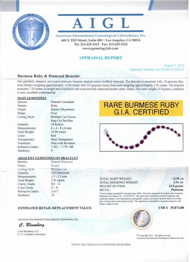 One polished, stamped, and tested platinum bracelet marked Aaron Gofflieb Antwerp. The bracelet is mounted with: 18 genuine Burmese Rubies weighing approximately 14.90 carats, and 220 genuine round diamonds weighing approximately 3.91 carats. The bracelet measures 7.25 inches in length and is finished with a tension lock clasp and double safety clasps. This item weighs 23.8 grams, condition is new, excellent workmanship. #MAIN GEMSTONES# Species: Natural Corundum Variety: Ruby Origin Burma (Myanmar) Shape: Oval Cutting Style: Brilliant Cut Crown, Step Cut Pavilion Quantity: 18 Rubies Measurements: 6 x 4 - 8 x 6mm Total Weight: 14.90 carats Color: Red Transparency: Semi Transparent Treatment: Heat with Residues Refractive Index: 1.762 - 1.770 DR Hardness: 9 #ADJACENT GEMSTONES ON BRACELET# Identity: Natural Diamond Shape: Round Cutting Style: Brilliant Cut Quantity: 220 Diamonds Measurements: 1.3 - 1.5mm Total Weight: 3.91 carats Clarity Grade: SI1-I1 Color Grade: G-H Refractive Index: 2.417 Hardness: 10 TOTAL RUBY WEIGHT: 14.90 cts TOTAL DIAMOND WEIGHT: 3.91 cts WEIGHT OF ITEM: 23.8 grams METAL: Platinum Size: 7 1/4