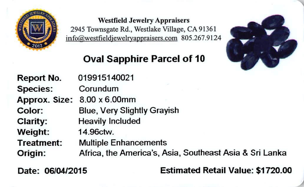 Ten oval mixed cut natural blue sapphires, measuring 8.00 x 6.00 x 4.00mm, exact total weight 14.96ct., clarity is heavily included, type II, very dark, very slightly grayish, blue color, (GIA B 8/3), cut is good. Measurements are an average for the group. Transmitting light diffusely, opaque. Naturally occurring internal & external characteristics are present. Indications of multiple laboratory enhancements. Westfield Appraised at $1,720.00.